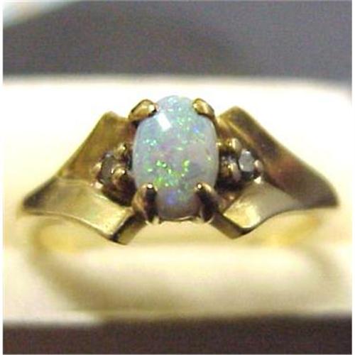 Lovely vintage 10k yellow gold ladies ring, adorned with very pretty oval opal stone and 2 tiny diamond stones on each side of the opal - This ring has Art Deco look and it is size 6 - Lovely Ring!!! - Very good condition - Free of damage - Stone measure little over 1/4" long and it is quite colorful - Buyer to pay 6.00 for ship plus insce - Thanks!