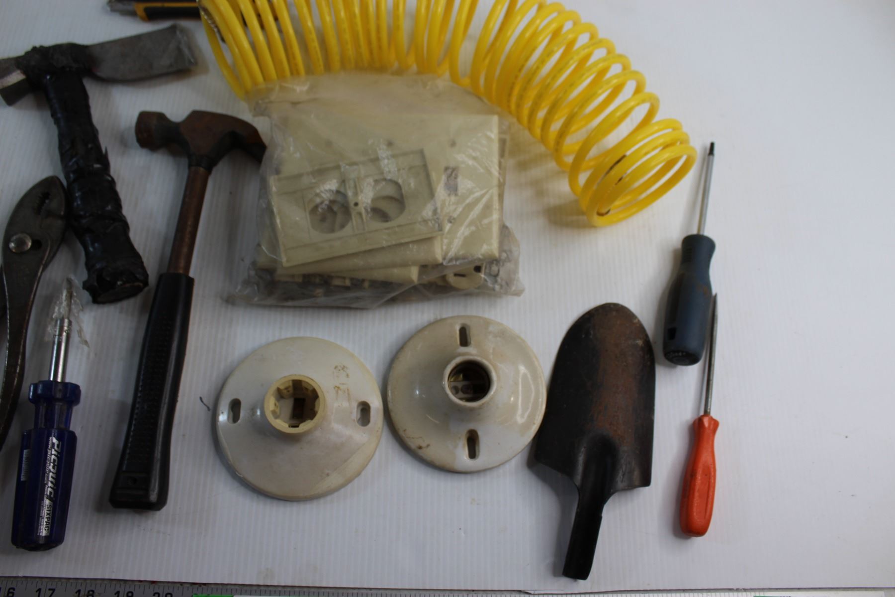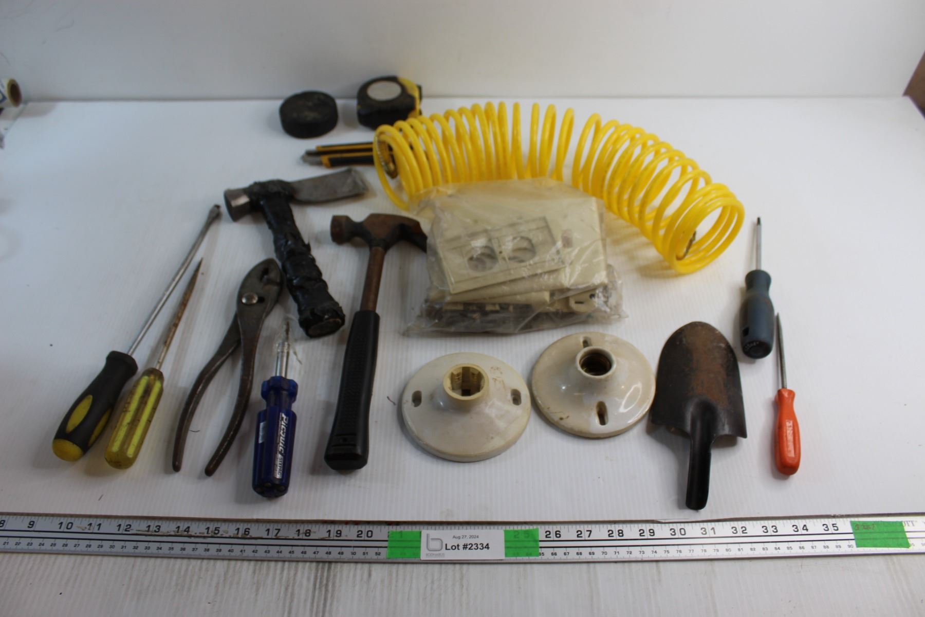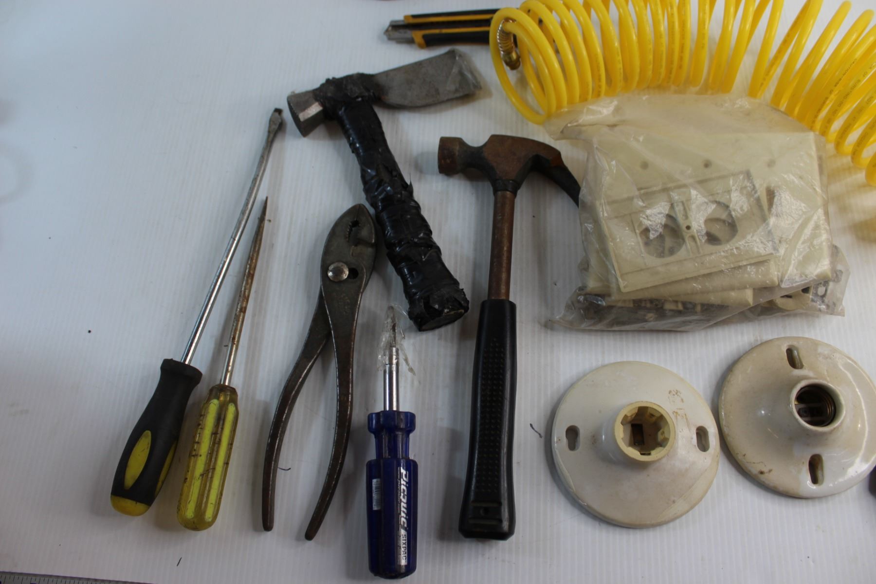 Yellow Hose, Assorted Hammers and Screwdrivers and Assorted Items