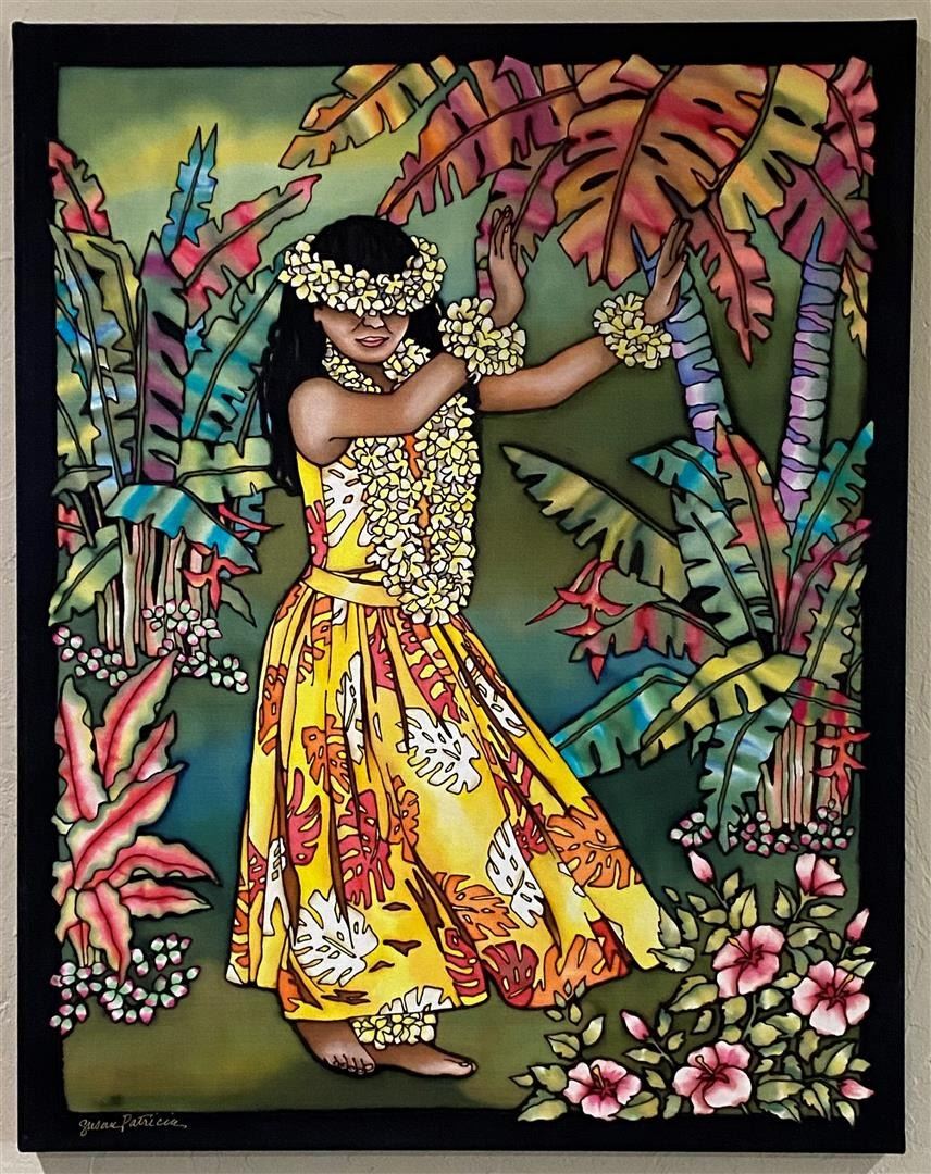 Hawaii's renowned artist Susan Patricia depicts a dance movement in "Yellow Hula", an original painting on silk 28x22"