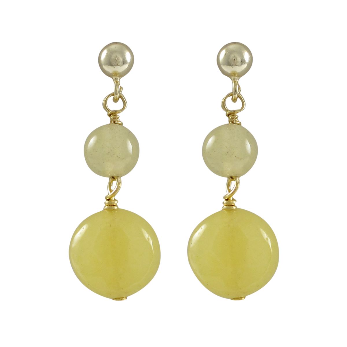 Yellow Jade 6Mm Round Ball And 10Mm Round Flat Semi Precious Stones Dangling, On Gold Plated Sterling Silver 4Mm Ball Post Earrings, 1.10"