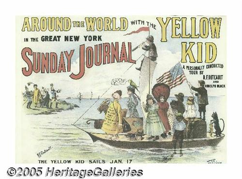 <B>Yellow Kid Print.</B></I> Hully Gee! The Yellow Kid was America's first comic character superstar and made the comics a permanent part of our culture. William Randolph Hearst, the publisher of <B>The New York Journal</B></I>, was well aware of the Yellow Kid fever in New York City, and finally lured Outcault away from Joseph Pulitzer's <B>The New York World</B></I> and put him to work at a much higher salary, drawing the Yellow Kid for the <B>Journal</B></I>. R. F. Outcault and the Yellow Kid demonstrated that the Sunday comics could sell newspapers and other forms of merchandise, and firmly established the comics as an integral part of the American newspaper. A beautiful offset print based on the advertising poster from the turn of the century, this full-color 15.5" x 21.5" photo offset print is in Excellent condition.