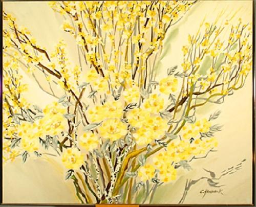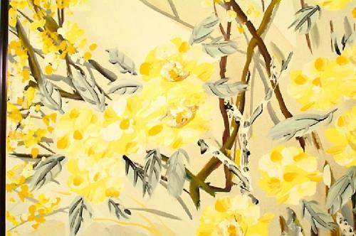Frederick, Conrad (American 20th Century) oil on canvas, flower motif high relief in canvas collage on canvas, signed lower right, "C. Frederick". California artist, 56 1/2" by 58".