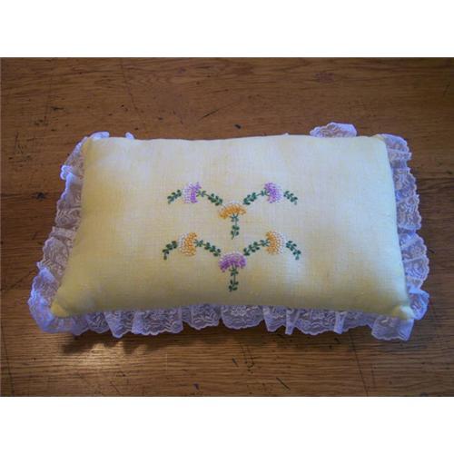 There are a pair of these.This one is yellow in color(linen material?)Very pretty floral needlework with French knots.Measures 13 1/2x8 1/2 not including lace trim.