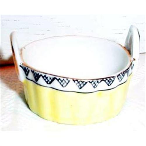 This fantastic Porcelain Basket or Bucket Shaped Open Salt is hand painted with a yellow bottom and gold trim around the top edge. The open salt is in SUPERIOR condition with no chips, cracks, or dings and it measures 1.50" in diameter and stands 1" tall. It is marked on the bottom with the familiar green Noritake Green Wreath Logo.