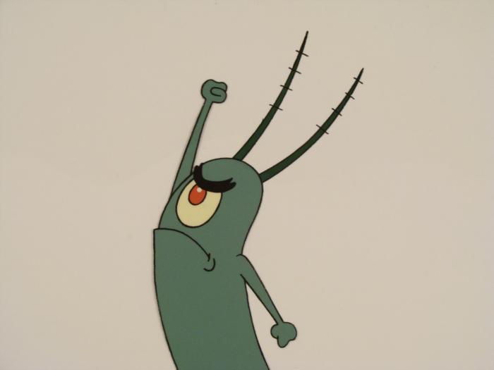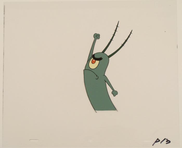 This original animation cel is from the Nickelodeon TV show SpongeBob Squarepants. The story takes place under the deep blue sea in Bikini Bottom, where SpongeBob resides. SpongeBob, who is a yellow, porous sponge, is your typical happy-go-lucky character, as he is always cheerful and enjoys making people laugh. Patrick Star, SpongeBob's neighbor who is a starfish, is your average children's show idiot, as he boasts knowing nothing and is often getting himself into ridiculous situations. Between the homes of these two lies the home of the miserable Squidward, a squid, who is known for being grouchy and playing tricks on SpongeBob and Patrick. Both SpongeBob and Squidward work at the Krusty Krab, a fast food business run by the greedy money-loving Mr. Krabs, a crab, the arch rival of the evil, possibly misunderstood, Plankton. Another neighbor, Sandy Cheeks, an athletic squirrel who normally wears an astronaut's space suit, was introduced in "Tea at the Treedome." She spends most of her time inventing and experimenting. Plankton has a yellow eyeOriginal Production Animated Cel Overall Size of Cel: 10 1/2" x 12 1/2" Very Good ConditionThis is an original hand-painted cel set-up used in the production of an episode of "SpongeBob SquarePants." Each one-of-a-kind set-up represents a slight change in position of the characters. When individually photographed and projected in rapid succession, the images appear to move.