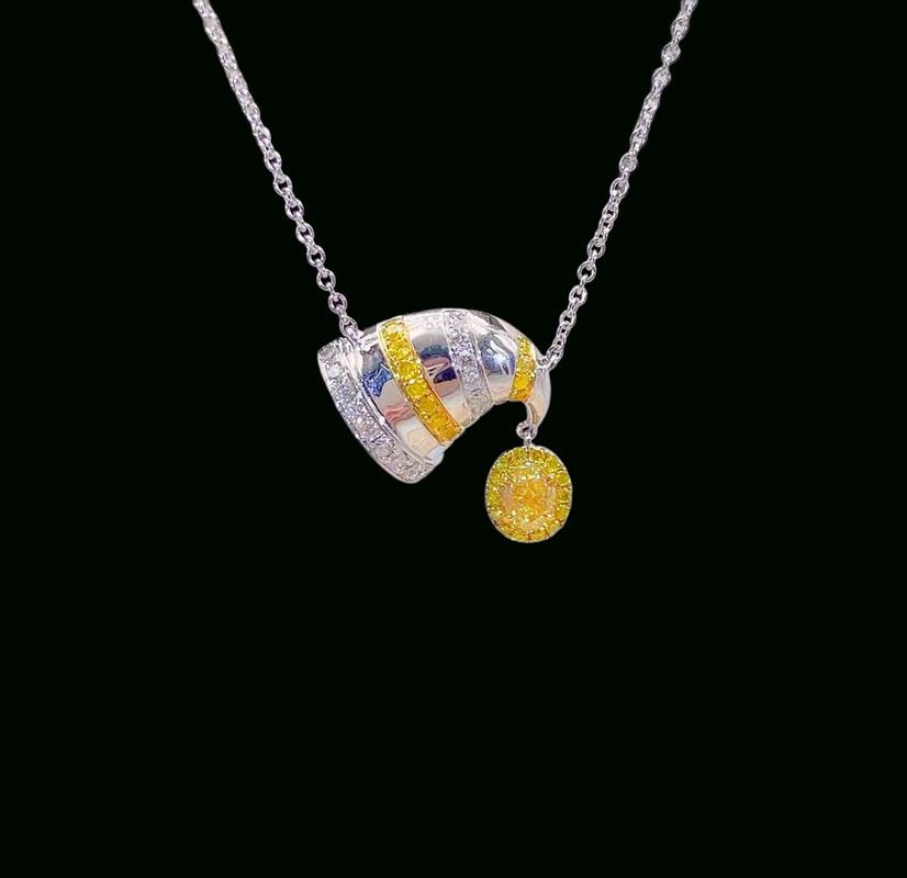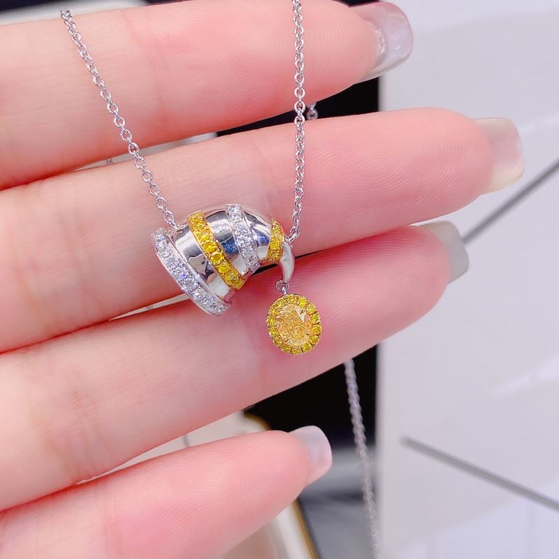 This yellow oval sleep hat necklace is inspired by a unique sleeping hat design, featuring yellow oval diamonds and sparkling white diamonds. The brilliance of each diamond shines together, emphasizing the necklace’s distinctive and elegant charm, blending artistic flair with luxury. Main diamond: 0.274 ct, side diamonds: 0.276 ct. Note: Comes with an AGL certificate and a domestic jewelry identification certificate.