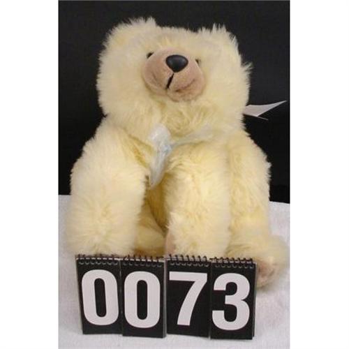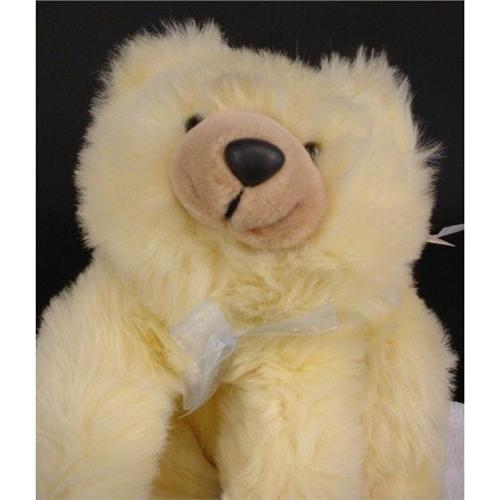 soft and cuddly pastel yellow plush bear made by MJC International. polyester fill and ca be posed sitting or laying down 18" high a nd very good condition .aprox 1/2Lb .[84]