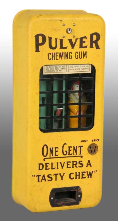 Description Working. Original paint with some dirt. Great mechanism inside with two weights and some vintage Pulver gum. Key is included. Condition (Very Good). Size 20" T.