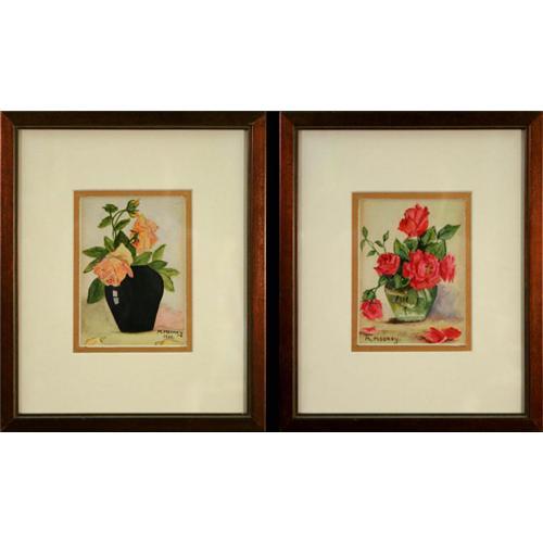 These two original watercolor paintings are an absolutely endearing set. The skilled artist, M. Mooney, has captured this still life beautifully. The colors are vibrant and the stark contrast between the vase and the roses makes these elegant blooms stand out even more. The second painting is a captivating still life of a vase of red roses also done in the 1930s. This piece is a testament to the beauty of the rose. The colors are vivid and capture the essence of the still life wonderfully, making it a joy to gaze at. The vase is exquisitely done as the colors swirl together to create the fluidity of a vase full of water. In both paintings, the medium has been applied with an adequate amount of water to help it flow and create graceful lines and subtle variations in color. The backgrounds also softly recede due to the dominant floral arrangements that remain the focus of these two paintings. They both have been double matted with a rich top mat of cream and an incredible bottom mat of metallic copper, which matches the copper wood frames absolutely perfectly. These are quite compelling pieces despite their size of 9? x 11?, which also includes the fantastic copper frames in these dimensions. Each has been signed by the artist, even dated on one of the paintings. These enchanting works of art will add a vintage touch to any room, while cheering it up as well. This is truly a remarkable buy for pieces that are so lovely.