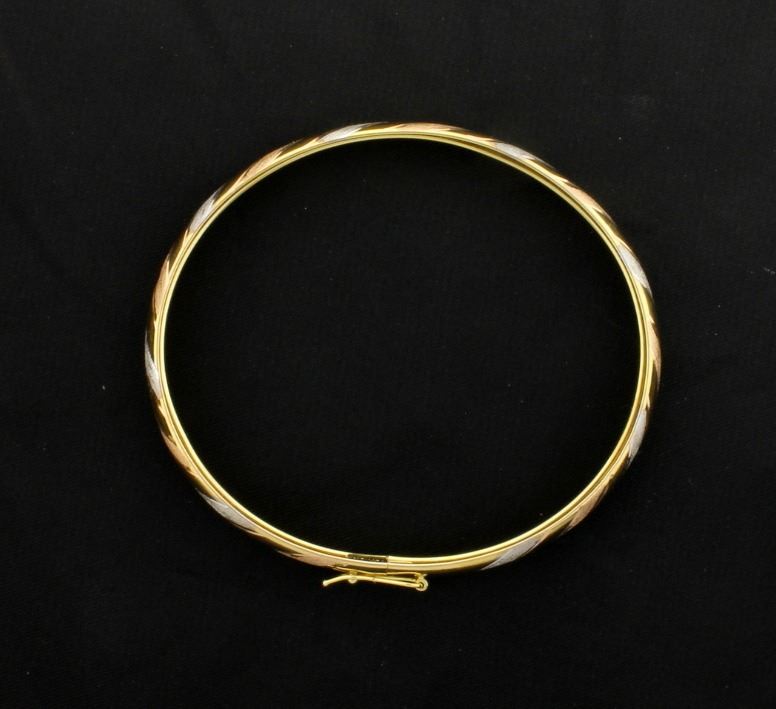 In 10k Gold. With a beautiful design it is about 2 1/2 inches in diameter and has a safety clasp. 3.9g