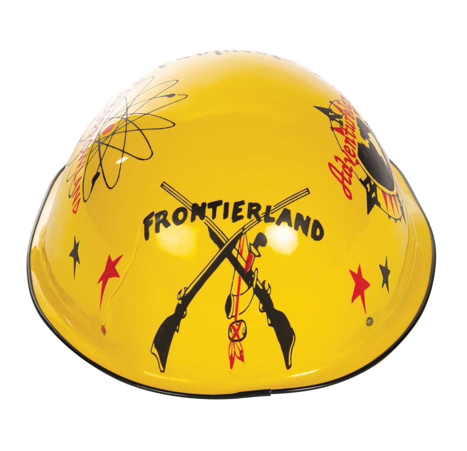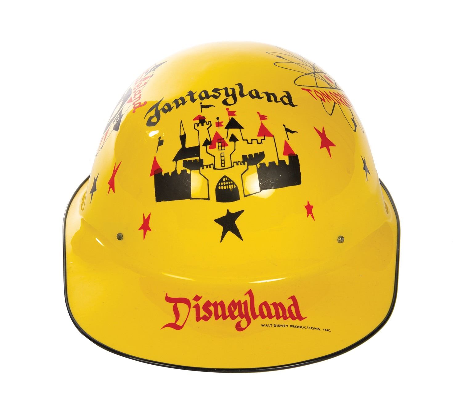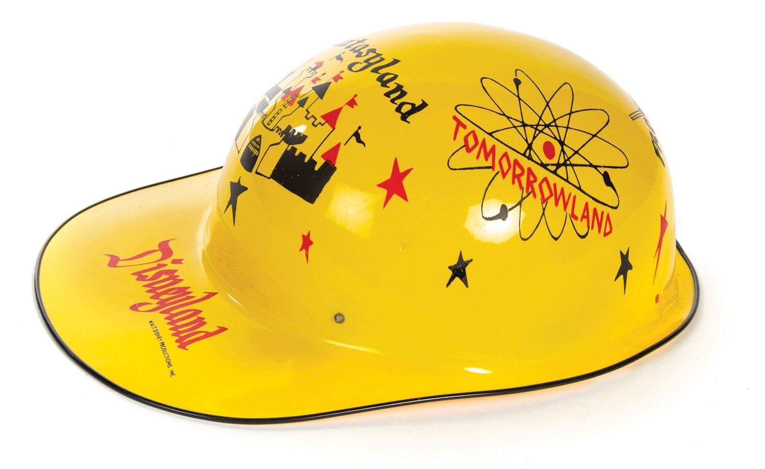 (Disneyland, 1950s) A souvenir yellow "Keppy Kap" featuring artwork of the different lands of the park. The original manufacturer's sticker is still attached to the inside of the cap's dome. Measuring 11"x7.75" and 4.5" tall, the cap is in good condition with minor wear and a crack on the back side of the cap which runs through the interior strap's button hole, leaving the strap loose from the cap.