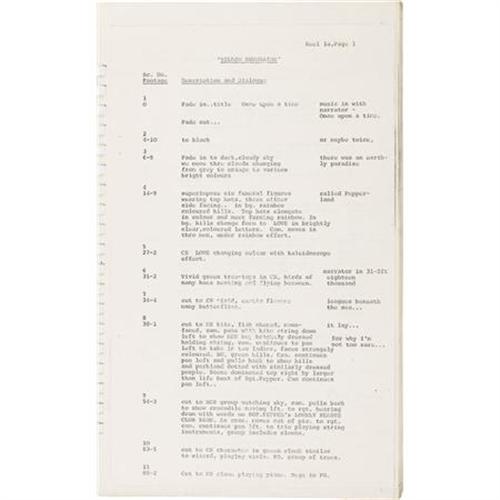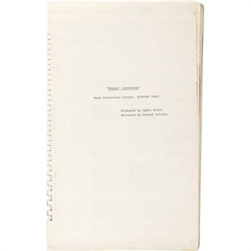 <B>"Yellow Submarine" Movie Script.</B></I> A rare spiral-bound post-production script for the Beatles animated feature, dated January 1969. Released at the height of the psychedelic pop culture period of the '60s, the movie was a box-office hit thanks to both its wild. surreal images and its extensive Beatles soundtrack. Ironically, The Beatles themselves were not enthusiastic in participating in a motion picture at the time, thanks to the unpleasant experiences with <I>Help!,</B></I> <I>Magical Mystery Tour,</B></I> and their eponymous animated series. However, they did see it as a convenient way to complete their three-picture commitment to United Artists. In the end, they were impressed enough by the final product to make a live-action cameo appearance in the final scene. The script is in Very Fine condition with mild wear and some some minor cover soiling.<BR><BR><b>Shipping:</b> Flat Material, Small (<a target="_blank" href="http://www.heritageauctions.com/common/shipping.php">view shipping information</a>)