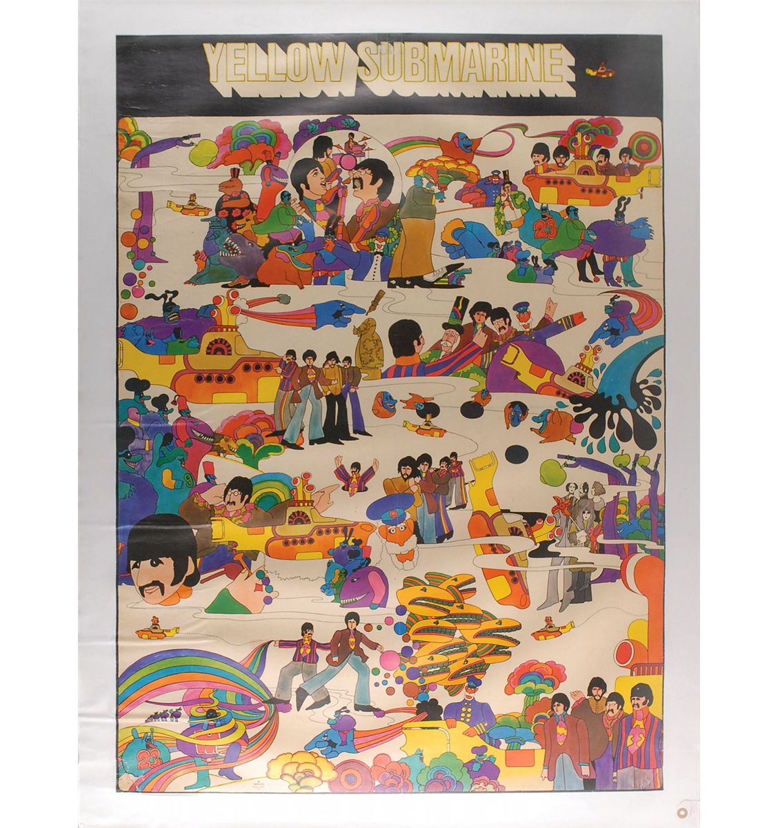 Vintage color 27.5 x 38.5 souvenir poster for Yellow Submarine, printed in France by Hallmark. Poster has been linen backed to an overall size of 30.5 x 42.5. In very good condition, with light intersecting storage folds, some scattered light creases, tape remnants to top edge, and some mild toning. A September 2004 Christie’s auction tag is stapled to the lower right corner. Rolled.