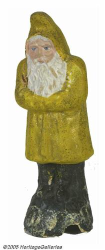 <B>Yellow Suited Santa Candy Container</B></I> The container stands only 8 3/4" tall. The bottom was broken out when the candy was removed, but Santa still stands nicely holding a remnant of his tree. His kindly but stoic face is nicely done, while the tip of his hat has suffered a minor bump which is hard to see. Most versions similar to this have Santa in his traditional red suit, while the yellow with gold sparkles is a bit more unusual. Lot:252