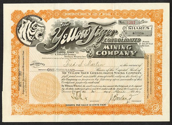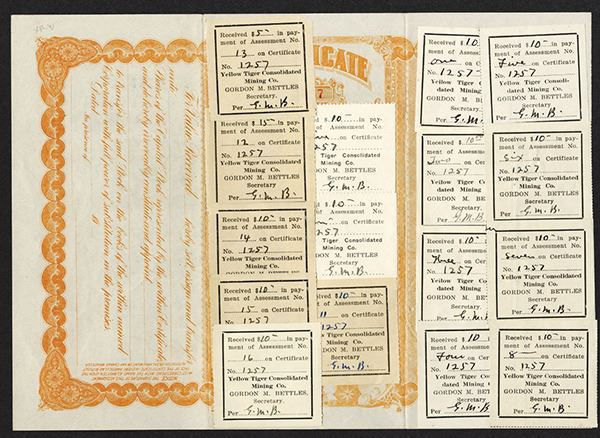 Nevada. 1000 Shrs Stock Certificate. Issued. Uncancelled. Numerous assessment coupons pasted on back. Nice Choice Very Fine.