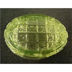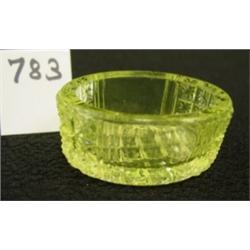 Yellow vaseline glass salt dip. Oval with pressed star pattern. 2-1/4" x 1-5/*'. 1" tall. Condition: Flea bite on outer rim. Hardly visible.