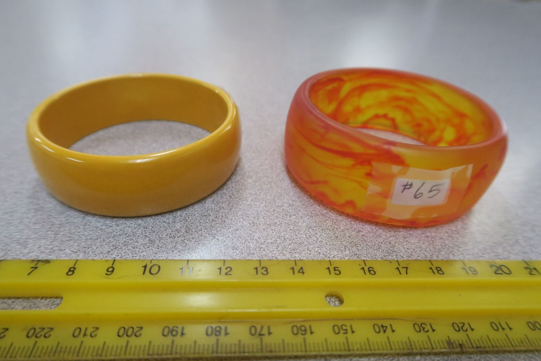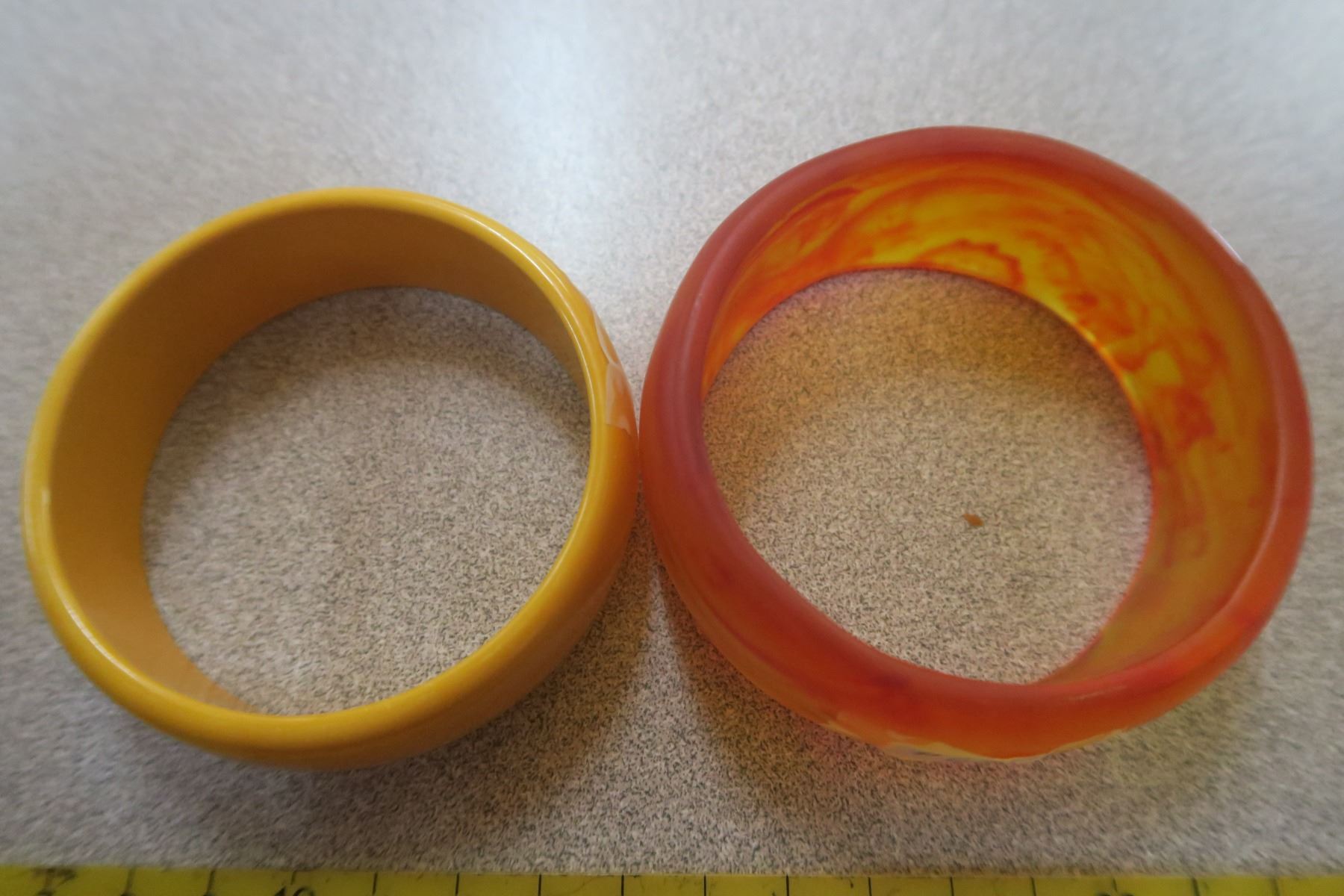 Yellow bakelite bangle and orange & yellow swirl lucite bangle