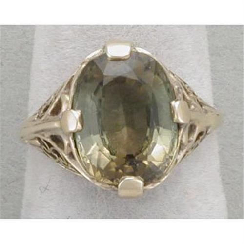 Something different. Yellow gold (10K, marked) filigree ring set with a 9MM x 11MM toffee-colored tourmaline (estimated to weigh approximatley 4 carats. It is a size 6 and weighs 2.6 grams.
