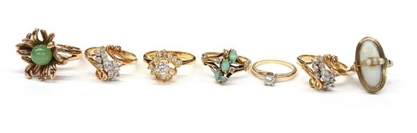 Collection of seven rings; mostly mounted in 10k and 14k yellow gold, three fashion cluster rings. Total weight of gold ring 17.2 grams