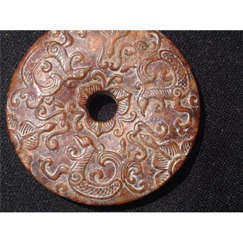 Ancient yellow jade carving in shape of a round disk with a central perforation (hao). The carving features 3 dragons separated in between by a large flower decor. The carving dates to Western Han period, is in high relief and present on both sides. This carving is rare, possible unique. Size: 2.8" diameter (7 cm.). Estimated value: $4000. Provenance: Dr. Veleanu's jade collection, the renown author of illustrated collectors' textbook: "Jade, 5000 BC to 1912 AD, Guide to collectors'.Estimated market value: $4000.