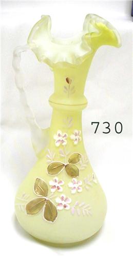 Yellow-lime cased satin glass ewer with gold and enamel decoration with frosted handle – base marked Webb – app. 9 ¾”