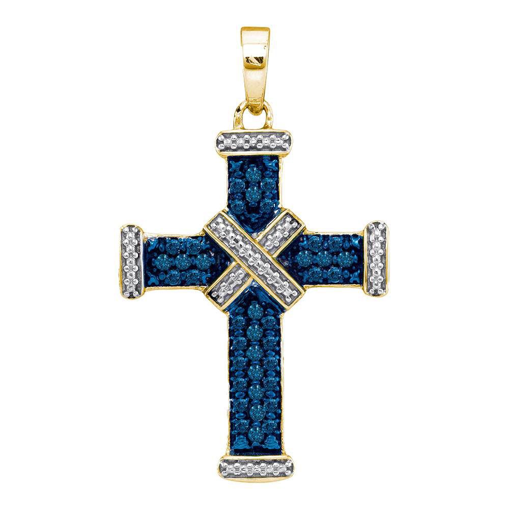 SKU: RB89177 ---- Yellow-tone Sterling Silver Round Blue Color Enhanced Diamond Cross Religious Pendant 1/4 Cttw