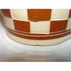 Yelloware Mocha checkerboard creamer. Stands 4 3/4" tall and is stamped P.A.W. on bottom. Has minor wear to handle and a few chips to base.