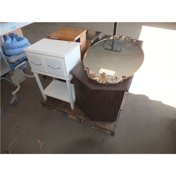 you get it all for one money, 2 wooden end tables, missing drawers, 1 small wooden stand, small ottoman...used