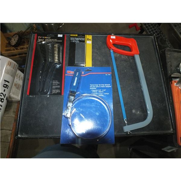 you get it all for one money, swivel grip oil filter wrench, hack saw, 3pc wire brush set and a 2pc pocket sharping stone...new
