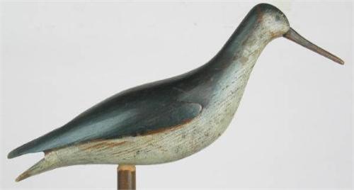 Yellowlegs decoy from NJ attributed to a game warden with the last name of Wallace. Painted eyes, carved wing detail, and a split tail. Fine OP with wear along the wood grain lines on the breast. From a Duxbury decoy collection. Probably obtained from William Mackey. (decoy)