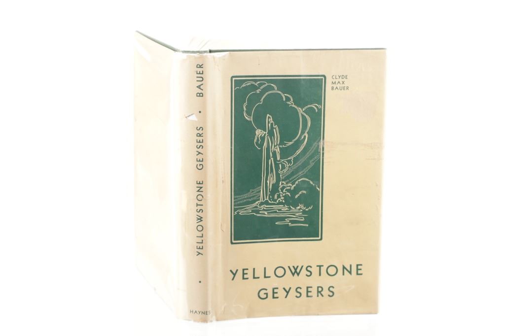 Featured in this lot is this revised edition of "Yellowstone Geysers" by Clyde Max Bauer, Ph.D., published by Haynes, Inc., Yellowstone Park, Wyoming, 1947. It is illustrated by Jack Ellis Haynes and was approved by the National Park Service. Clyde Max Bauer, Ph.D., was the Park Naturalist at the time of publication. This book has several photos and illustrations throughout, as well as details and stories of the Yellowstone National Park geysers. Jack Ellis Haynes, the famous photographer of Yellowstone and other National Parks. The many Haynes photographs are what make this edition special. This is one of the early works on Yellowstone geysers. Also includes a 1939 map of Yellowstone Park on pages 126-127. The book features a green coloured clothbound hardcover with gold gilt lettering and an illustration of an erupting geyser on the front cover. The condition of this book is good overall. Intact pages exhibit age tanning and very slight foxing consistent with the book’s age. It is in good condition and has a tight binding; there is little wear to the cover. Original paper dustjacket has some tearing, clear mylar covered. Measures 9.5" x 6.5"W x 9.5"L x 1"D, weight 1lb, 4oz