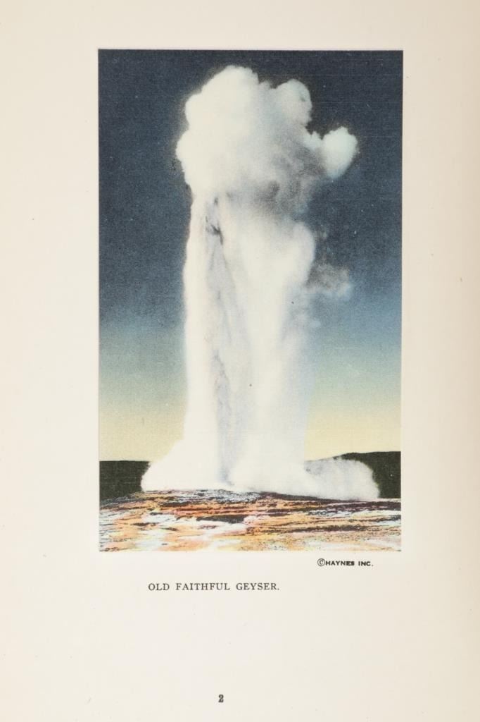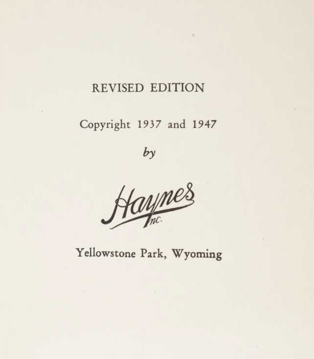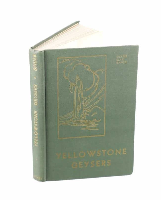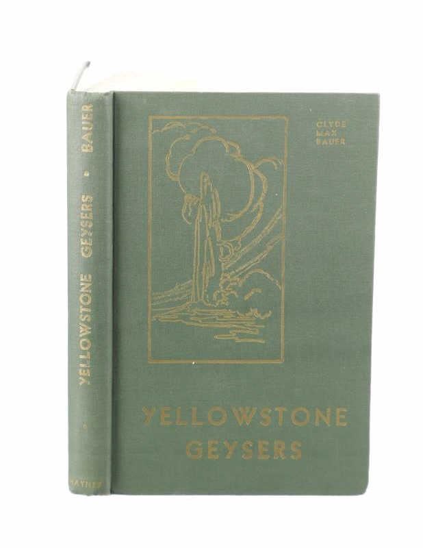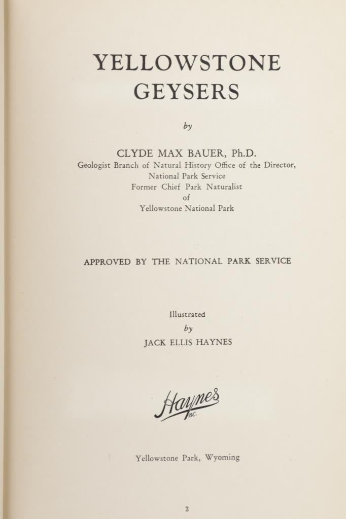Featured in this lot is this revised edition of "Yellowstone Geysers" by Clyde Max Bauer, Ph.D., and published by Haynes, Inc. in 1947. This book features an approval by the National Park Service. This edition was illustrated by Jack Ellis Haynes, the famous official photographer of Yellowstone and other National Parks. The many Haynes photographs are what make this edition special. The vintage black and white photography captures the beauty and power of the geysers. Geysers are a natural phenomenon found only in a few places in the world thus they fascinate us with their behaviour and striking beauty. An early scientific examination of the geysers at Yellowstone National Park. The author was the park naturalist and used his geologic experience and the extensive catalogue of official photographs from the Haynes photographers to bring a very instructive and attractive volume. At the end of the book is an alphabetical reference list of over one hundred geysers with facts about each. A map of Yellowstone locates the different geyser basins, mud volcanoes, hot springs, etc...The olive green cloth bound book has an illustrated image of Old Faithful geyser erupting on the front cover, is in good overall condition, slight scuffing noted to cover edges, foxing and age tanning noted. Measurements 6.25"W x 9.5"L x.5"D