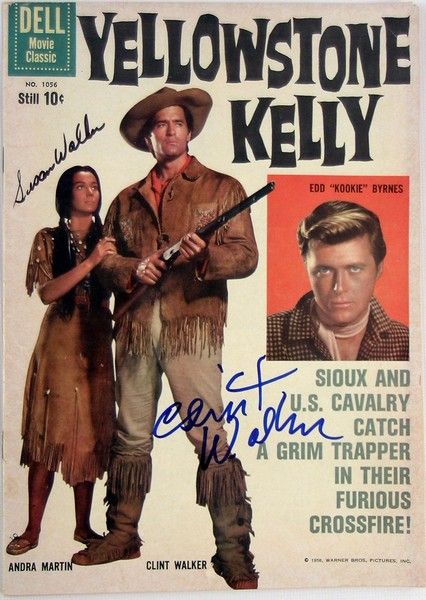 Clint Walker ("Cheyenne"), and Edd Byrnes ("77 Sunset Strip") were the biggest TV stars of the early 1950's. To ride the wind of their popularity, they both starred in the western "Yellowstone Kelly" (1959), which became a huge success. This is an extremely rare original Dell Movie Classic comic book of "Yellowstone Kelly". it is signed by Clint Walker and his wife Susan Walker who was the runaway "Araphaho woman" that Edd Byrnes falls in love with in the movie.