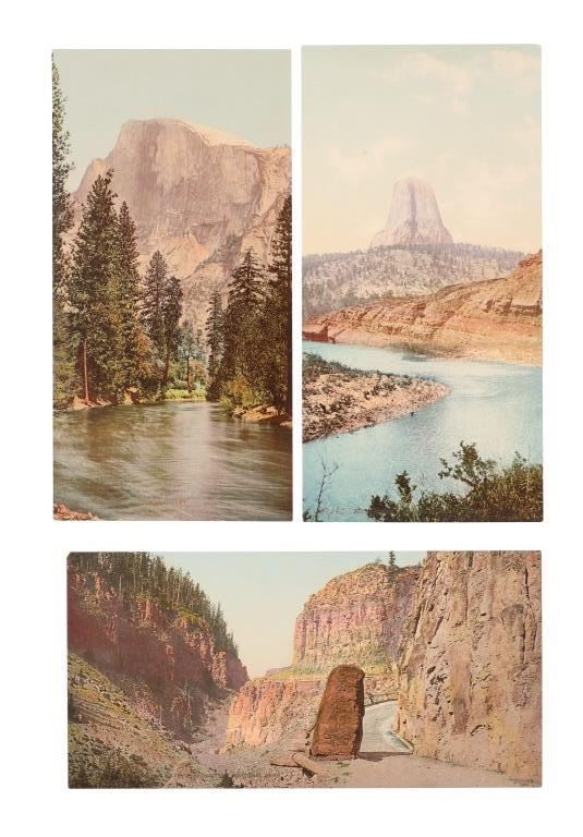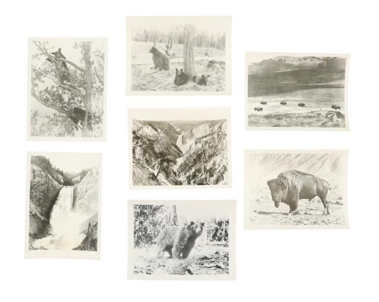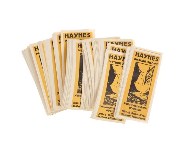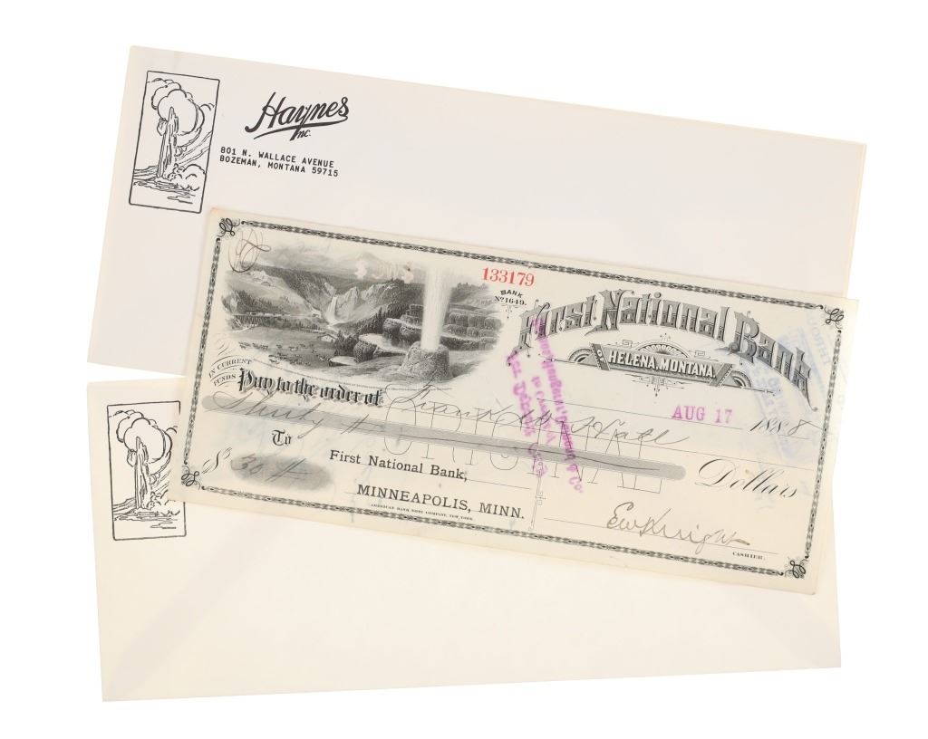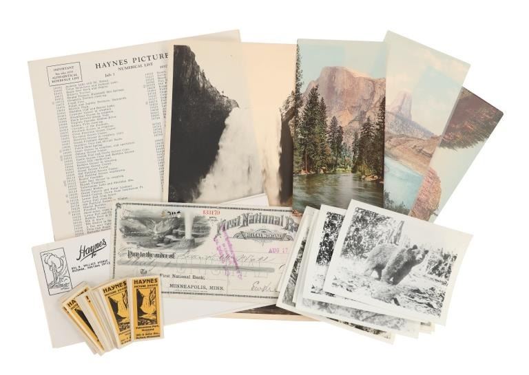 Featured in this lot is this Yellowstone National Park Haynes Collection, circa 1920s to 1968. The first designated national park in the United States, Yellowstone Park has captured the imagination of millions upon millions of people from all over the world. From stunning geologic formations to the thousands of wild animals that call Yellowstone home, Yellowstone was brought to the world's attention through the photographs of early explorers like Frank Jay Haynes. Haynes, known as F. Jay or the Professor to almost all who knew him, was a professional photographer, publisher, and entrepreneur from Minnesota who played a major role in documenting through photographs the settlement and early history of the great Northwest. He became both the official photographer of the Northern Pacific Railway and of Yellowstone National Park as well as operating early transportation concessions in the park. His photographs were widely published in articles, journals, and books, and turned into stereographs and postcards in the late 19th and early 20th century. Included in this collection are a hand coloured photo of the East Entrance, "51334 Golden Gate of Yellowstone National Park", a hand coloured photo of Devil's Tower, "51290 Mato Teepee or Devil's Tower, Wyoming", eight (8) black and white photos with Haynes Inc. stamped descriptions on the reverse, one large format photo of an original Haynes photograph "#10124 Great Fall from Below, 308 Ft., by Haynes, St. Paul", Yellowstone National Park, original "Haynes Picture Shops Yellowstone Park, Wyoming" stickers, a 1937 "Haynes Pictures Numerical List" of photographs, three (3) original unused Haynes Studios Bozeman envelopes, and lastly, a cancelled personal check dated 1888 for the First National Bank of Helena, Montana one year before Montana was granted statehood, the check bears an etched vignette of Yellowstone Park at the top left corner. The condition of this wonderful collection is good overall, no obvious marring noted. Largest item measures 8.5"W x 11"L, smallest is 1.25"W x 2.5"L, combined weight of the collection is U6oz.
