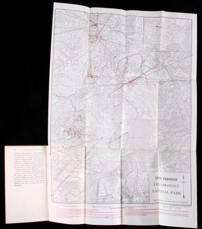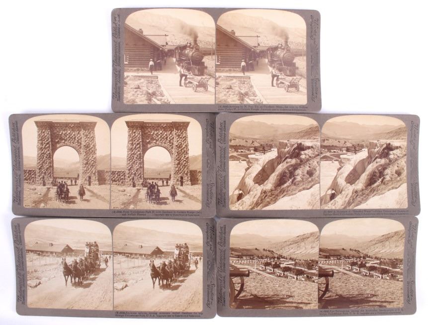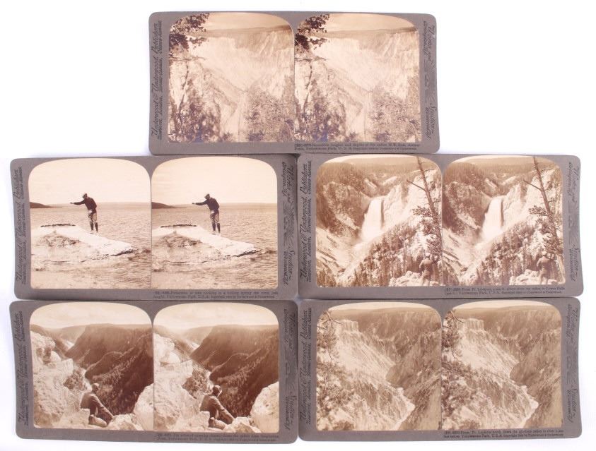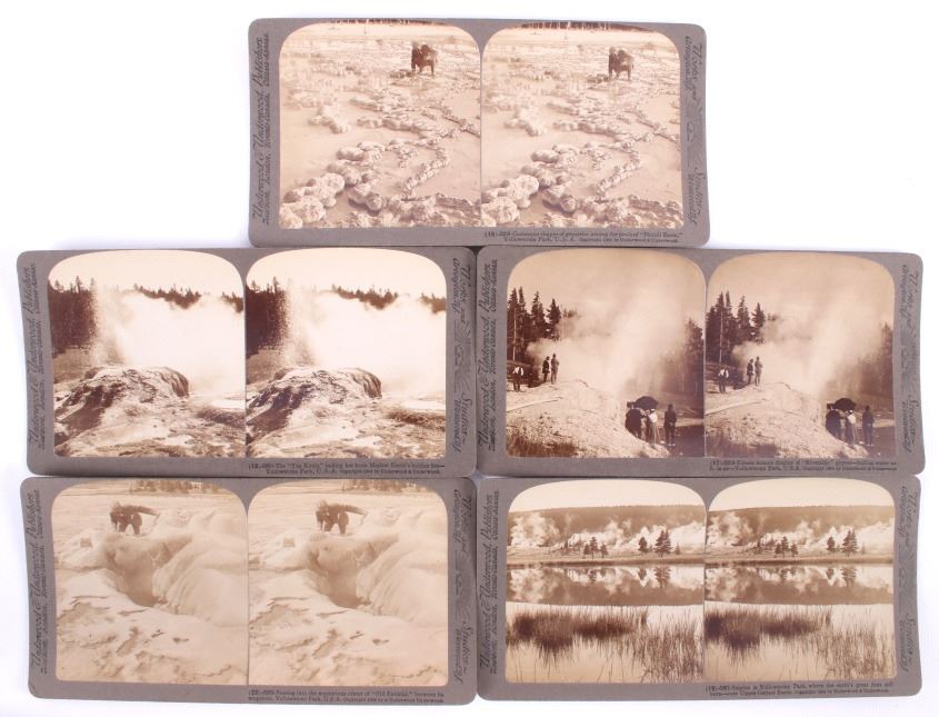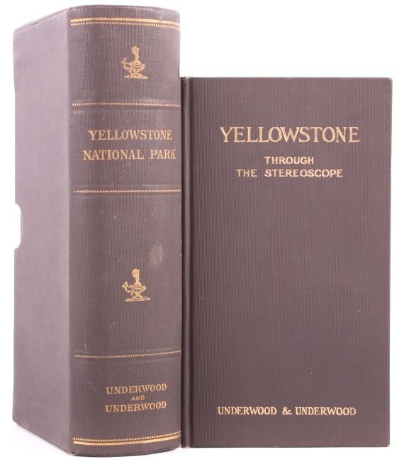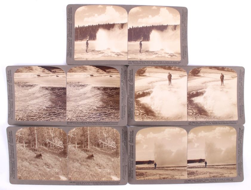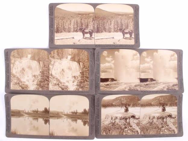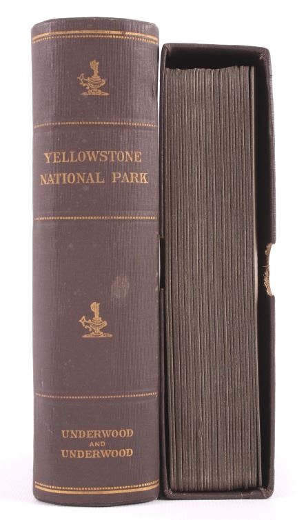 This is a set of 30 Yellowstone National Park stereoviews with guide book and folding map from circa 1909. The stereoviews were published by Underwood and Underwood and show numerous scenic points from inside the park including Old Faithful, Fort Yellowstone, Golden Gate, Keppler Cascade and many more. The stereoviews come with the original storage box. They are all in good condition. The box measures 4" x 7.75".