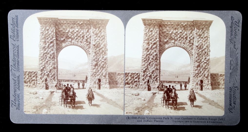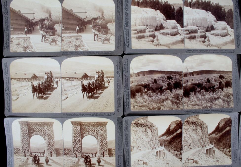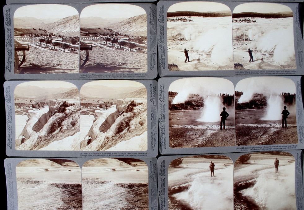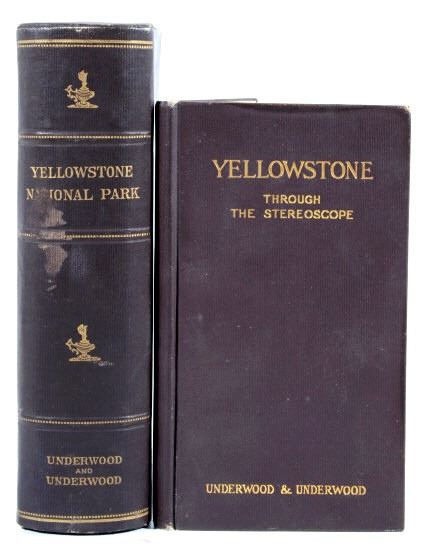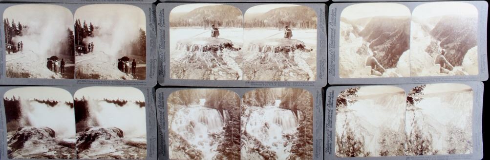 This is a set of Yellowstone National Park stereoviews and book published by Underwood and Underwood circa 1909. The set includes 30 different views taken form inside Yellowstone. The book serves as a guide for each of the views with a brief description of where each was taken. The book also contains a map with each of the views marked. This is a RARE piece that includes a complete set of stereoviews as well as the guide. The stereoviews and book are in good condition.