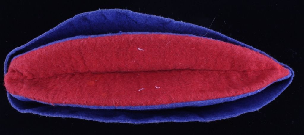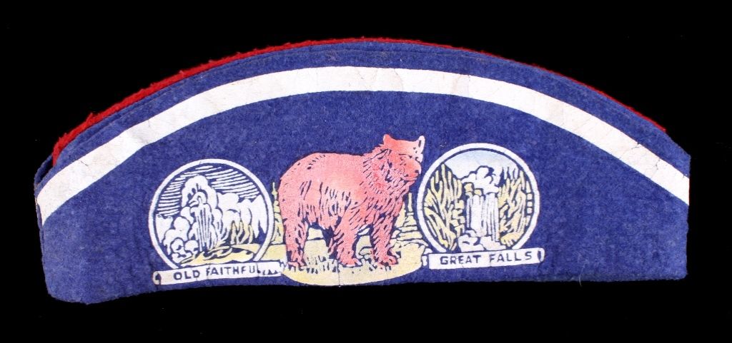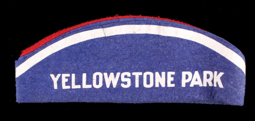 This is a circa 1900 Yellowstone National Park soveneir garrison cap. The piece shows great condition and is an original small adult or child's cap hat. One side reads, "Yellowstone Park" and the other shows a bear, "Old Faithful" "Great Falls". Measures 10"x4"