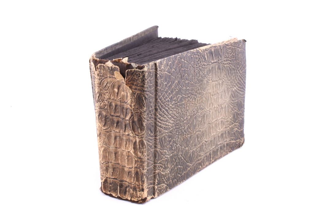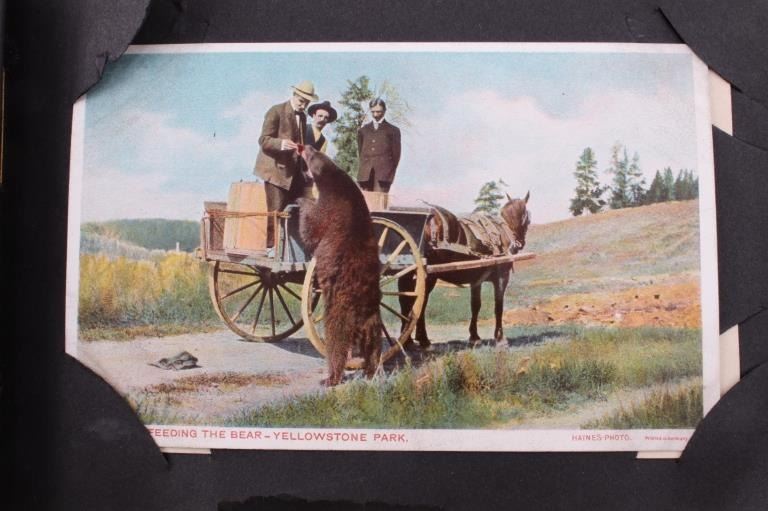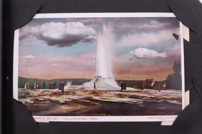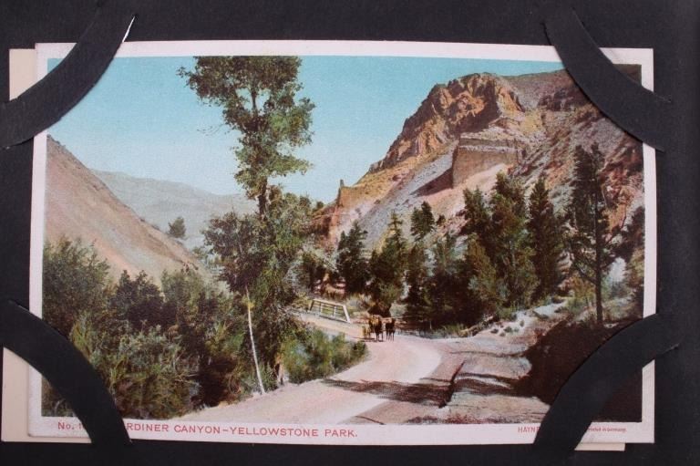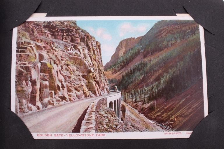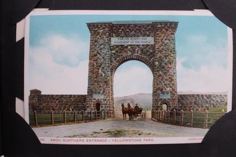 Included in this lot is a Frank Haynes Yellowstone Park Series 100 postcards original album. Frank Jay Haynes, known as F. Jay or the Professor, was Yellowstone's official park photographer from 1884-1921. His photographs were widely published in articles and books and made into souvenir postcards in the late 19th and early 20th century. These postcards are placed in an alligator skin album marked "Yellowstone Park Haynes" on the front cover. The album is in fair condition for its age, with some of the pages not attached to the binding. The album measures 5 1/4" x 7 1/4" x 2 1/4".