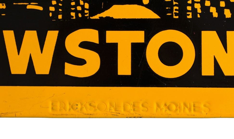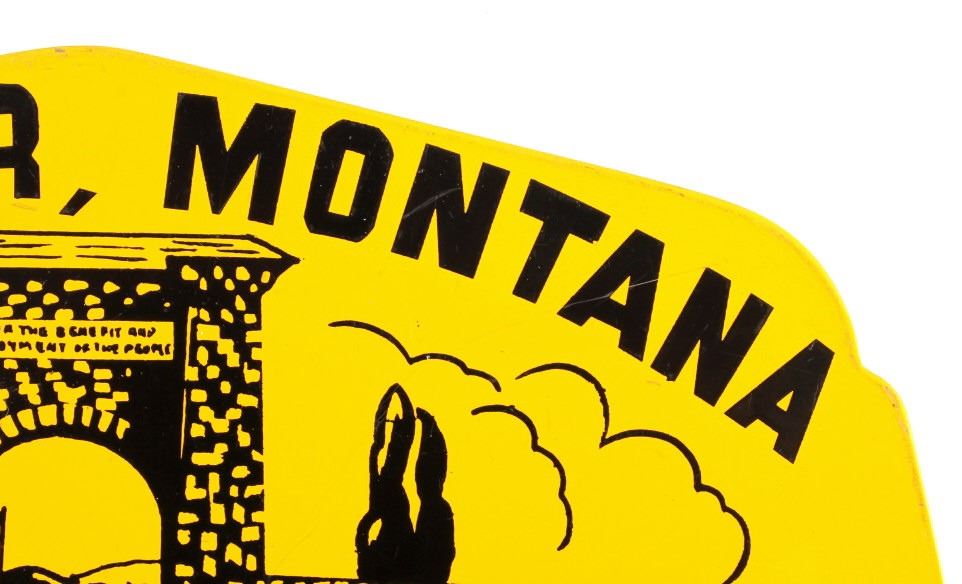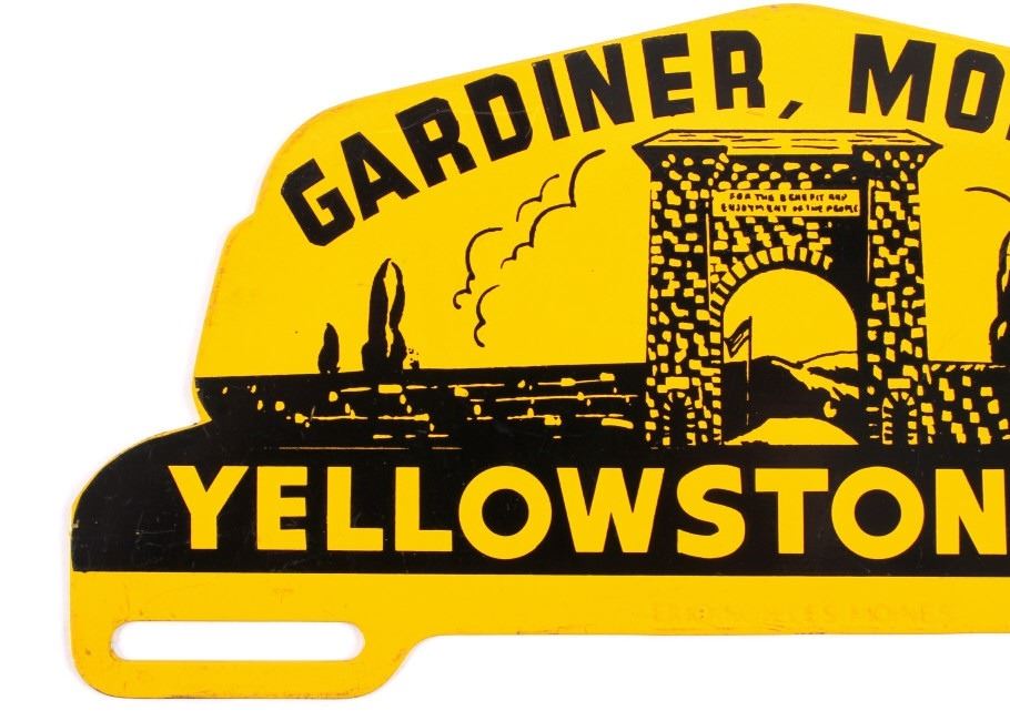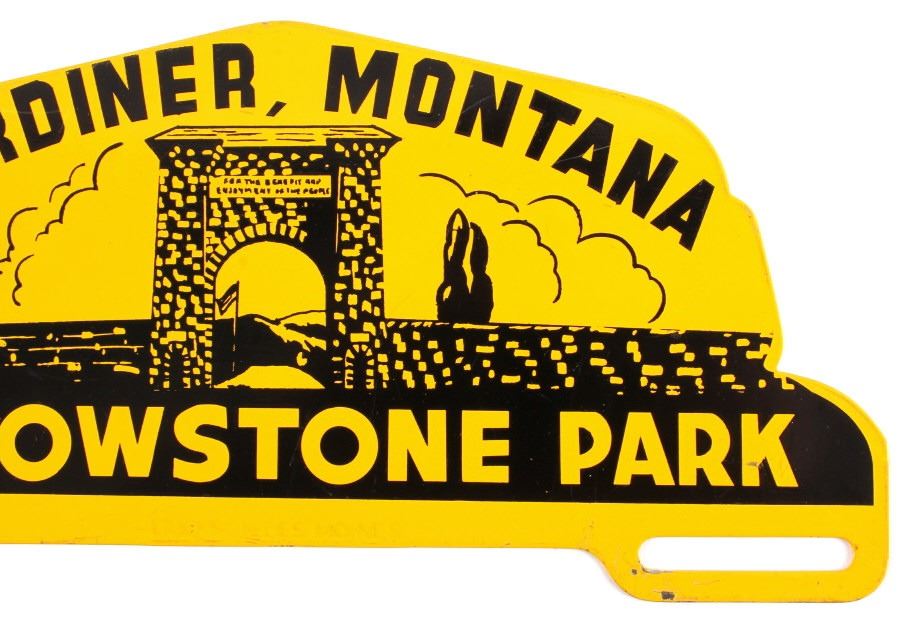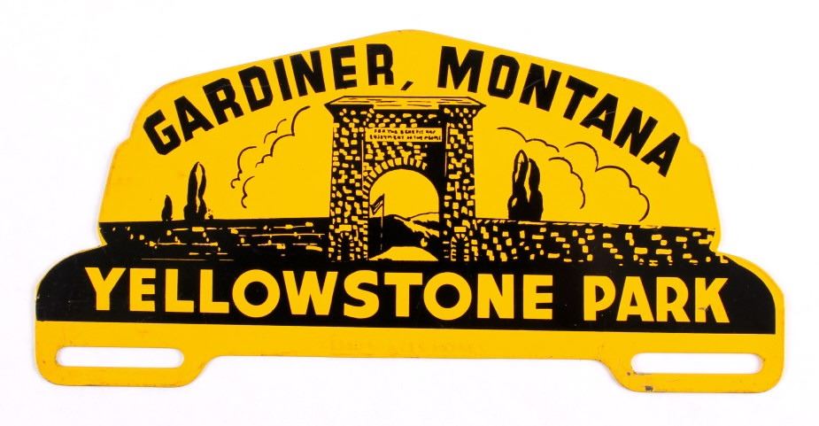 This is a license plate topper from Yellowstone National Park. The topper shows the Roosevelt Arch in Gardiner, Montana. The Yellowstone Park topper is in good condition. It measures 4.75" x 10".