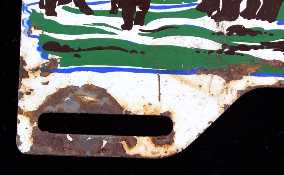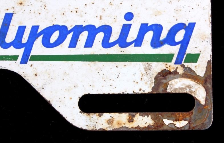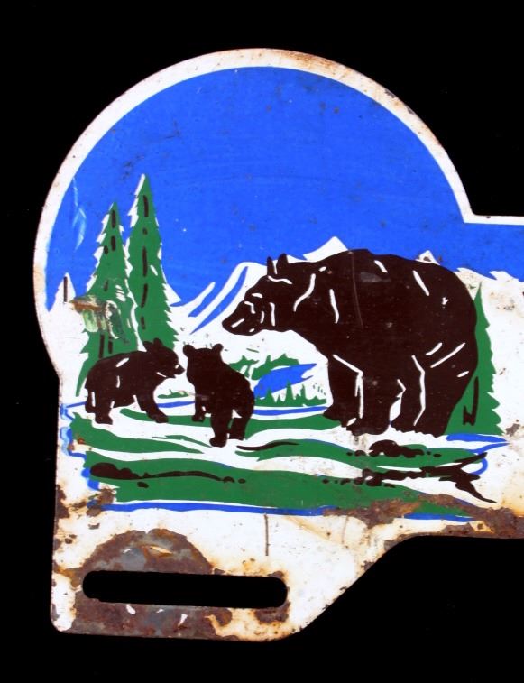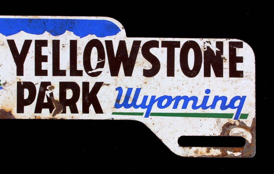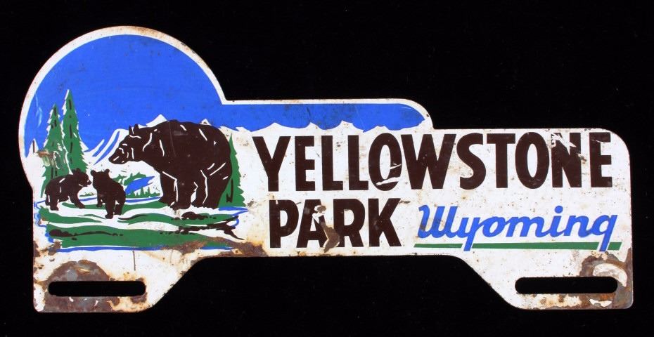 This is a Yellowstone Park license plate topper. The topper shows a bear and two cubs and reads "Yellowstone Park Wyoming". The license plate topper is in fair condition with some rust and paint loss. The piece measures 4.5" x 10".