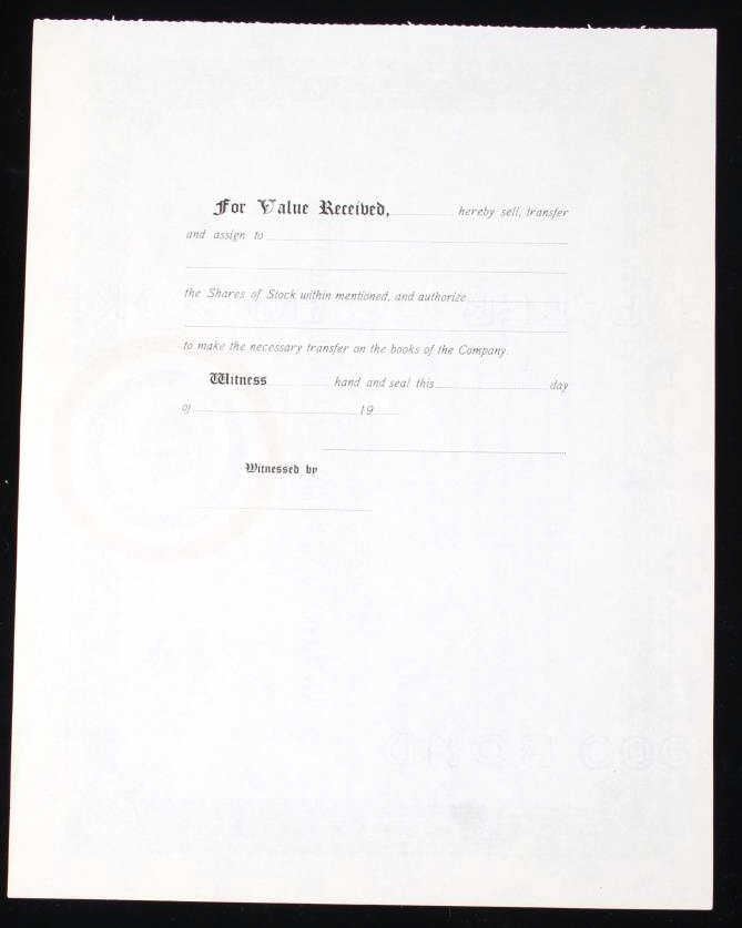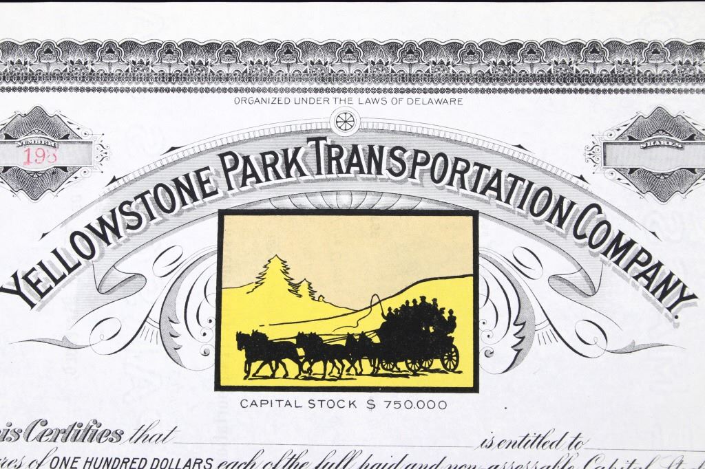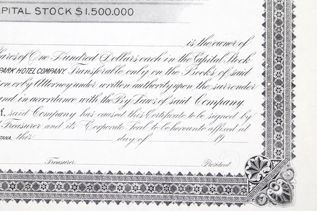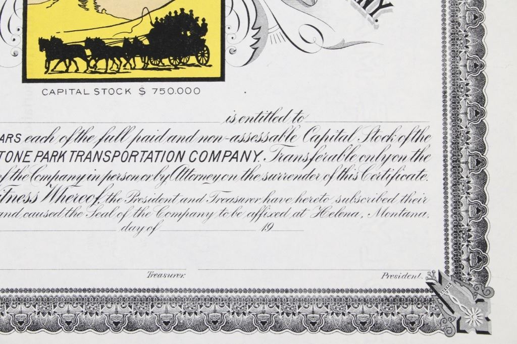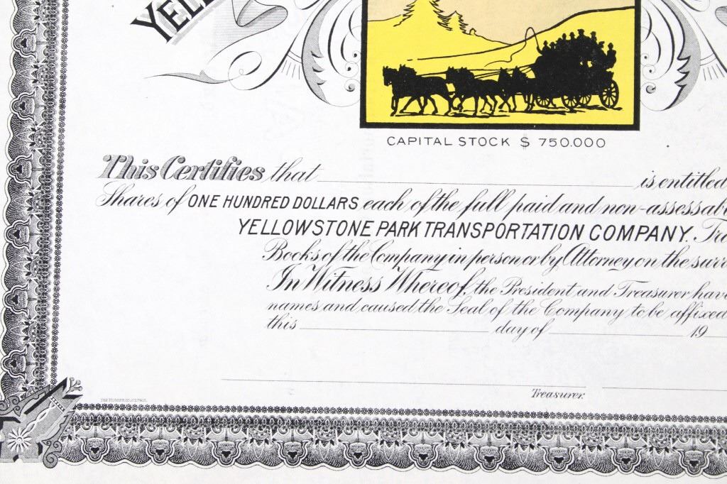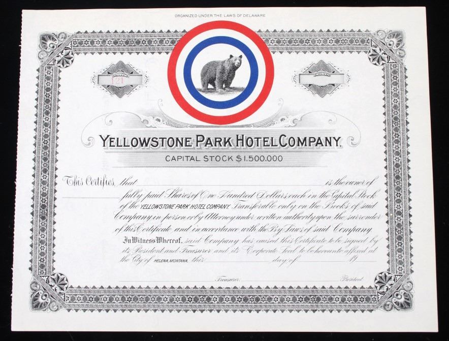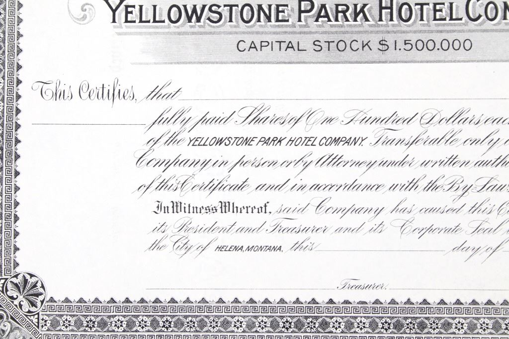 Featured in this lot are three (3) unissued certificates of capital stock for the Yellowstone Park Association (1), serial number #2046 dates to circa 1907-1910; the Yellowstone Park Transportation Company (1) serial number #198 circa 1900-1910; the Yellowstone Park Hotel Company (1), serial number #121 prior to merger 1936. Since the establishment of Yellowstone National Park there have been concession interests in the park. As early as 1871, a private "hotel" was operated in the park, and a boat concession was operated 1874-1876. While the different administrations were responsible for the management of the park, individual concessionaires have been responsible for providing the visitor a diversity of resource related to their visit. These have included transportation through the park, lodging and camping opportunities, and a host of other such services. In the initial years following the establishment of the park concessionaires began establishing facilities and services. Among those associated with Yellowstone National Park was the Yellowstone Park Company. The Yellowstone Park Company roots date back to the 1880's and in association with the Northern Pacific Railroad. Though the organization of this concession resulted in a number of associated company names (such as Yellowstone Park Transportation Company, Yellowstone Park Camping company, Yellowstone Park Hotel Company, Yellowstone Park Lodge and Camps Company), they fell under the umbrella of the Yellowstone Park Company.