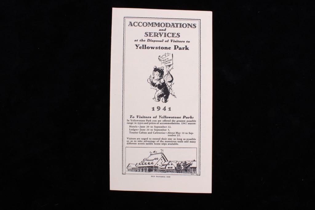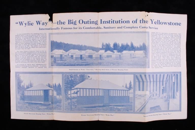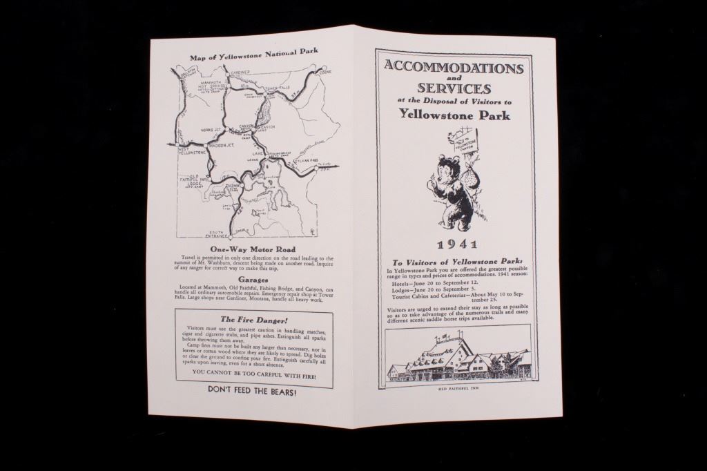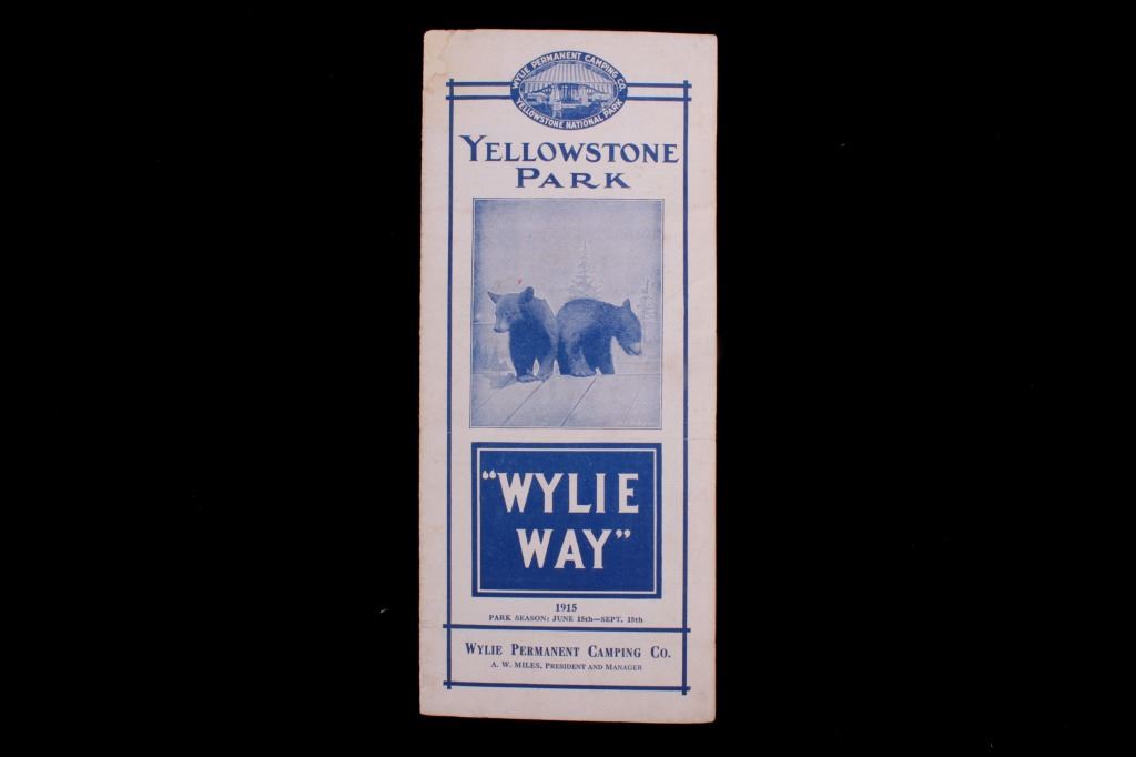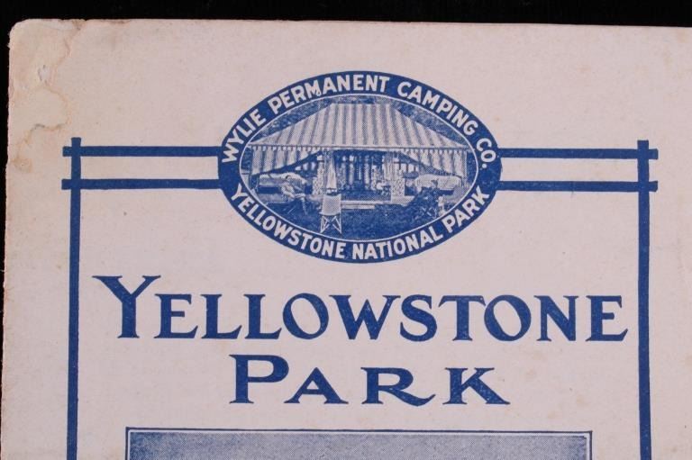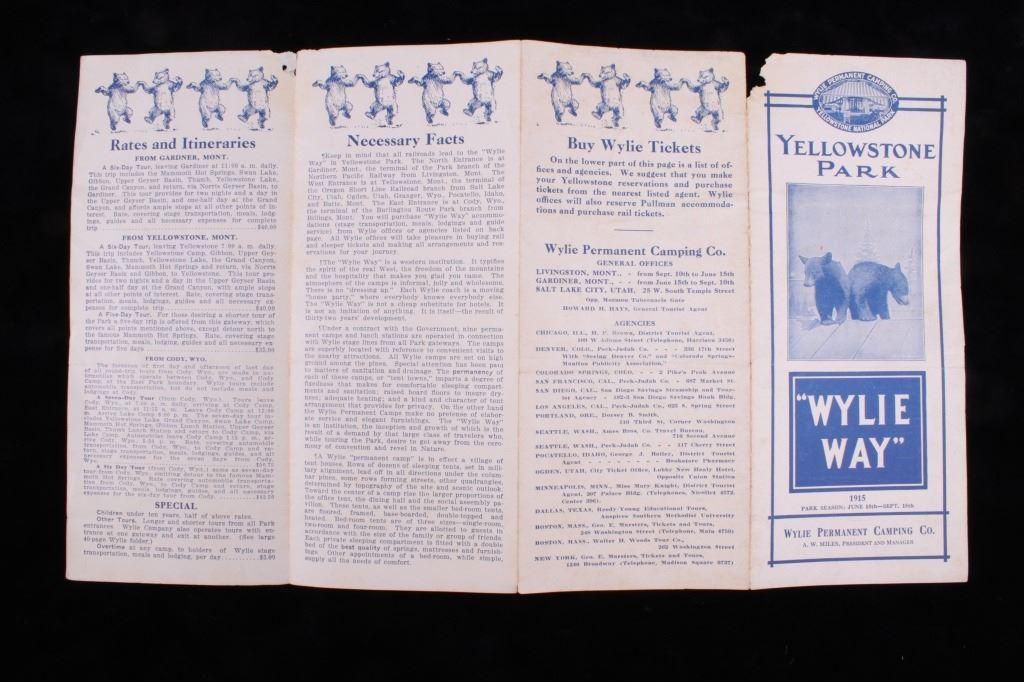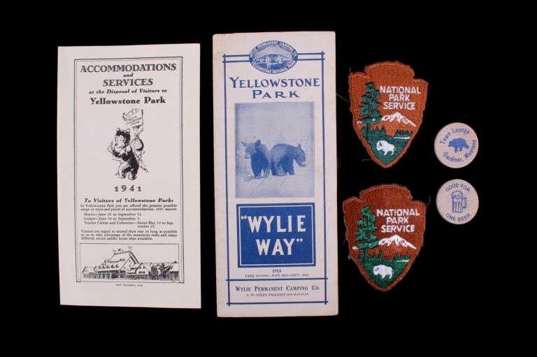 In this lot are two Yellowstone Park tourist pamphlets, two patches, and two wooden tokens for beer. The first pamphlet is from 1915 and is from the Wylie Permanent Camping Co. This shows the rates and itineraries and necessary facts for a tourist trip with Wylie Company in Yellowstone Park—a six day tour, including transportation, food, guides, and lodging is/ was $40.00 per person. This piece measures 15 1/2" X 9" unfolded. The second pamphlet is from 1941 and shows "Accommodations and Services at the disposal of Visitors to Yellowstone Park." This also gives dates and rates. This measures 9 1/2" X 8 1/2". The two patches are in the shape of an arrowhead and say "National Park Service", with trees, mountain, and a bison embroidered onto it. The patches measure 3 1/2" X 2 3/4". The two wooden tokens are printed in blue ink with "Town Lounge Gardiner, Montana" on one side and "Good for One Beer" on the other. These tokens measure 1 1/2" across. All these items are in very good condition for their age.