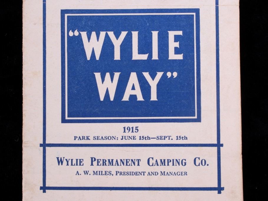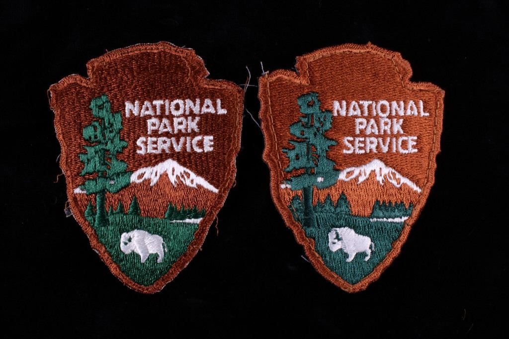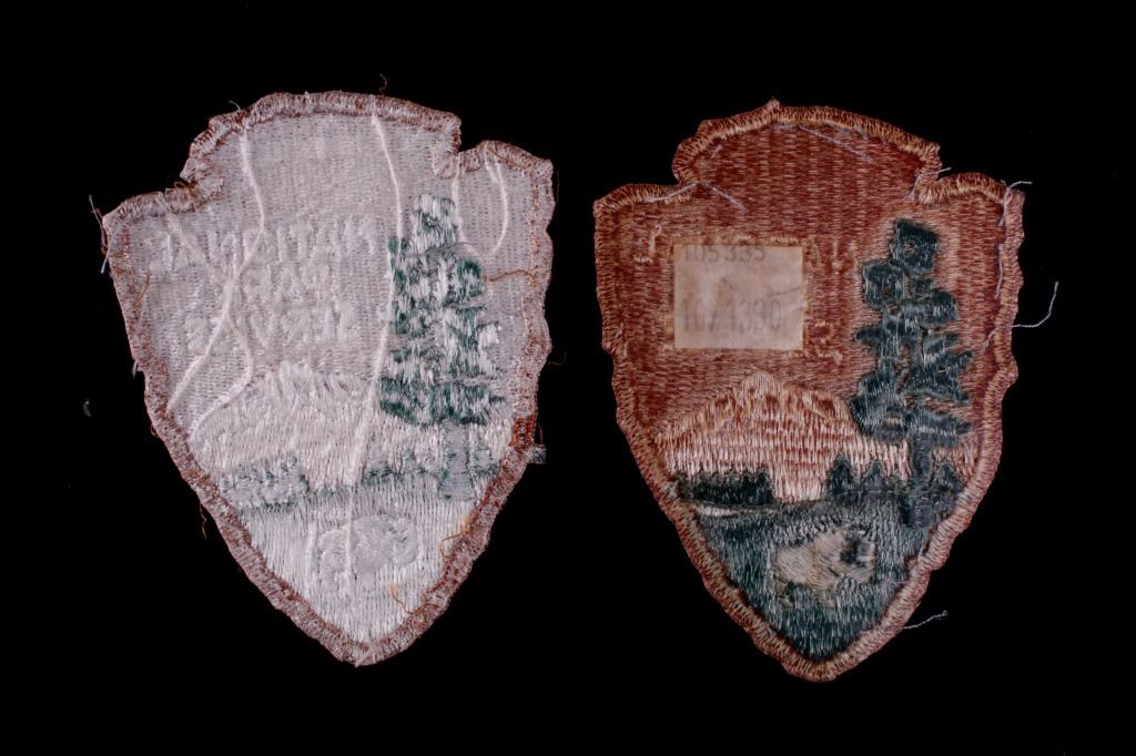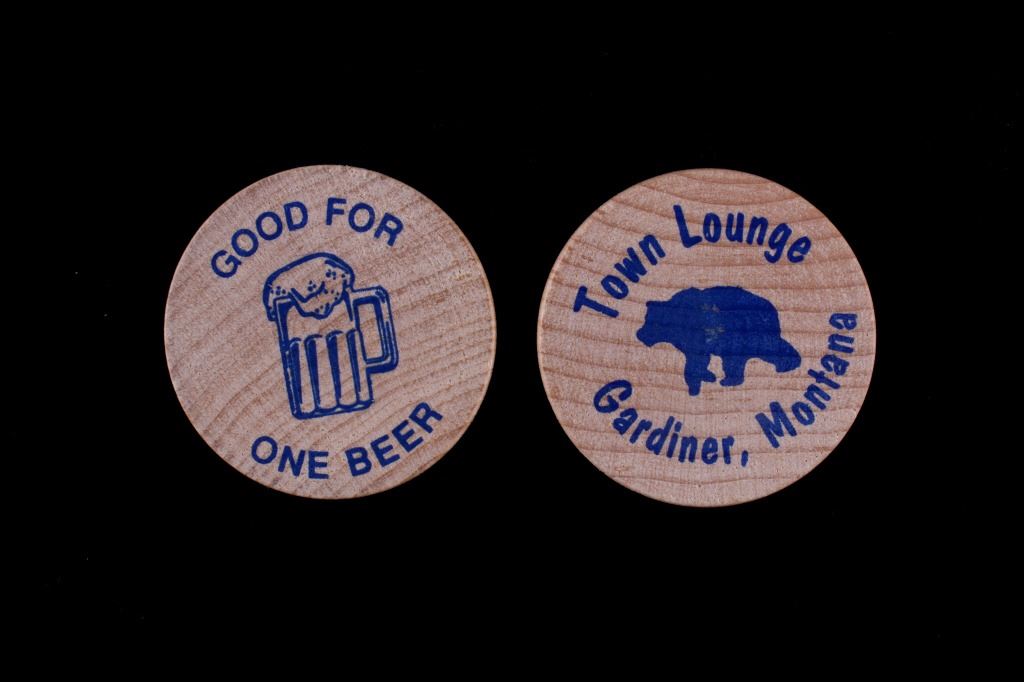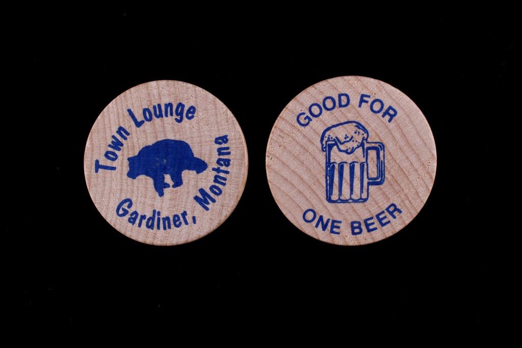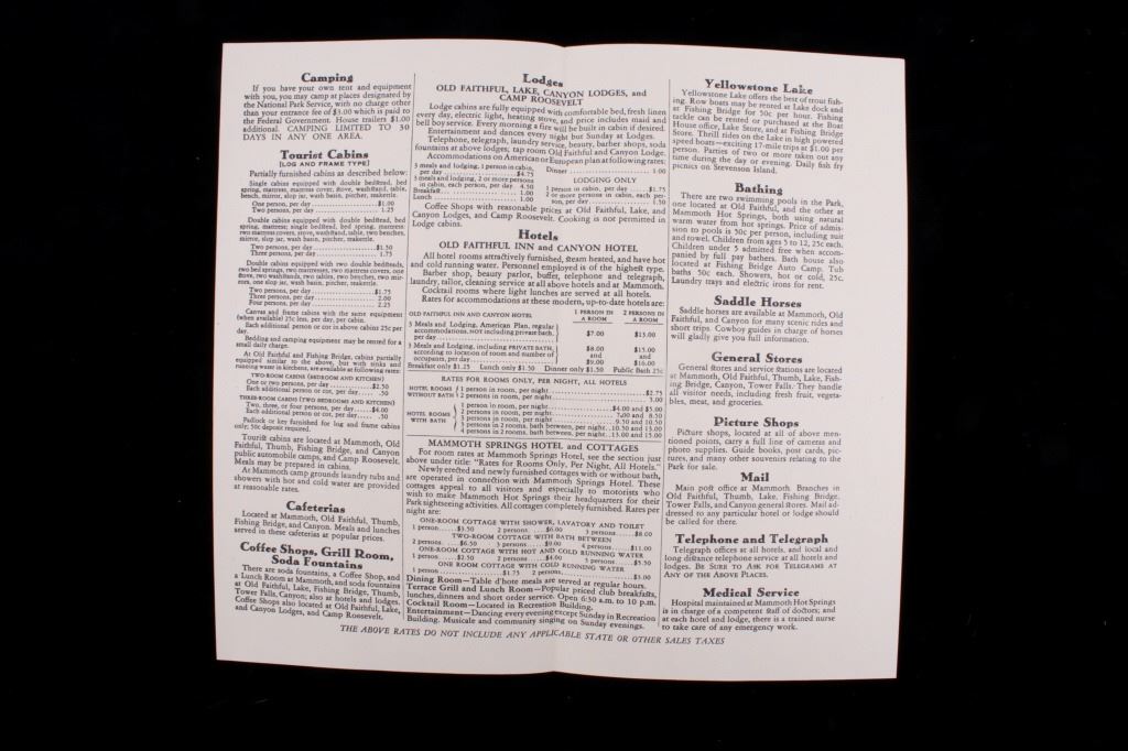 In this lot are two Yellowstone Park tourist pamphlets, two patches, and two wooden tokens for beer. The first pamphlet is from 1915 and is from the Wylie Permanent Camping Co. This shows the rates and itineraries and necessary facts for a tourist trip with Wylie Company in Yellowstone Park—a six day tour, including transportation, food, guides, and lodging is/ was $40.00 per person. This piece measures 15 1/2" X 9" unfolded. The second pamphlet is from 1941 and shows "Accommodations and Services at the disposal of Visitors to Yellowstone Park." This also gives dates and rates. This measures 9 1/2" X 8 1/2". The two patches are in the shape of an arrowhead and say "National Park Service", with trees, mountain, and a bison embroidered onto it. The patches measure 3 1/2" X 2 3/4". The two wooden tokens are printed in blue ink with "Town Lounge Gardiner, Montana" on one side and "Good for One Beer" on the other. These tokens measure 1 1/2" across. All these items are in very good condition for their age.