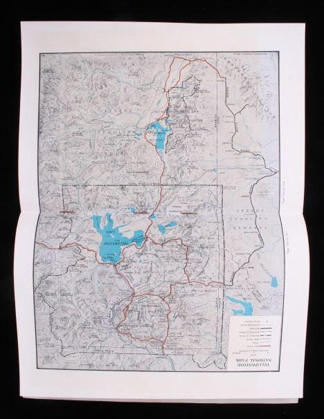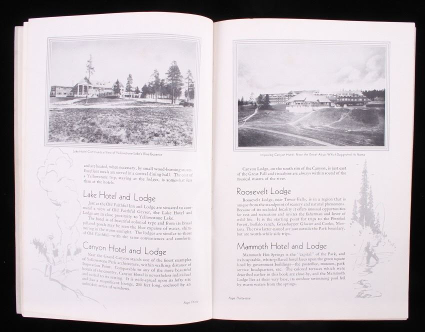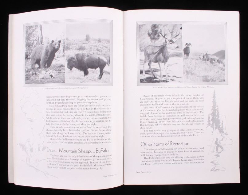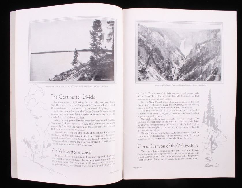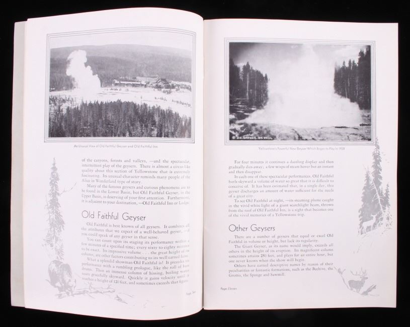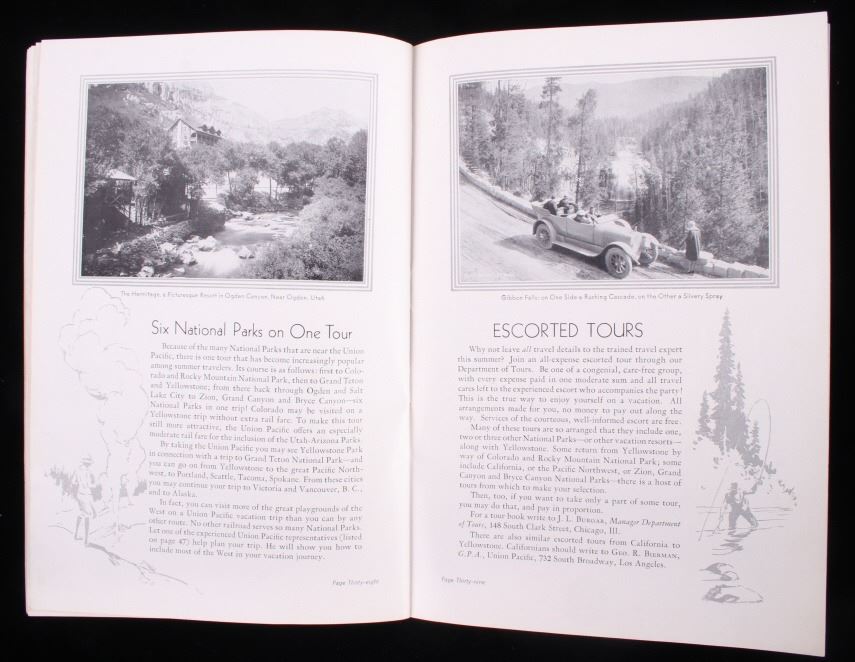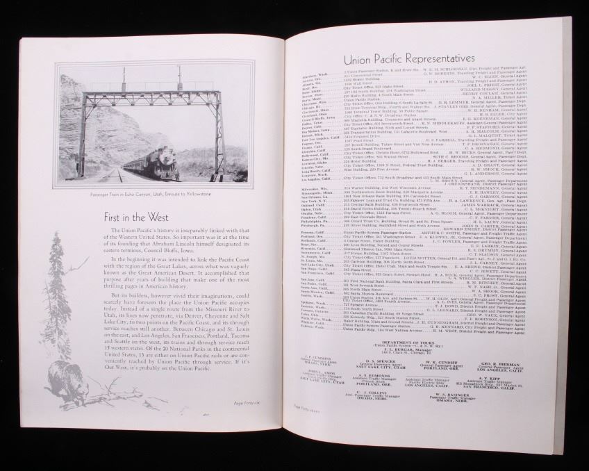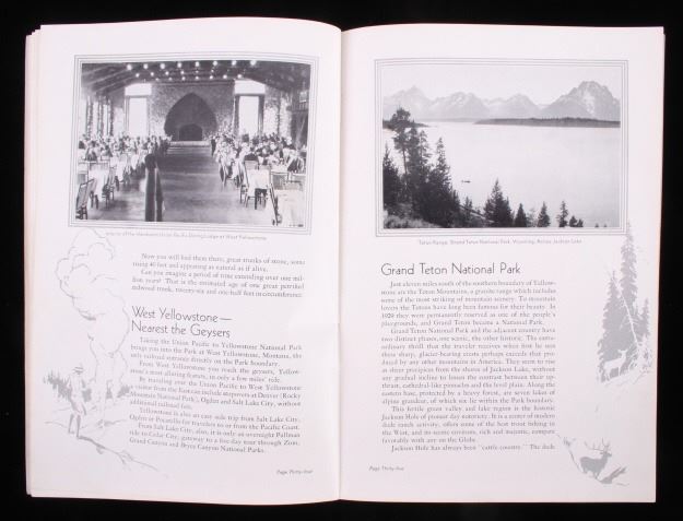 For sale in this lot is a Union Pacific Rail Road advertising portfolio for Yellowstone & Grand Teton National Parks. The booklet originates from the 1930's and advertises specifically for "The Overland Route". The route was jointly operated by the Union pacific and Central Pacific Rail Roads. The booklet has gold filigree font, and depicts Old Faithful geyser on the cover. The book includes maps, wildlife, and landscape photography, as well as many pages worth of excerpts. Overall, the book shows good condition. It measures 10" x 6 3/4".
