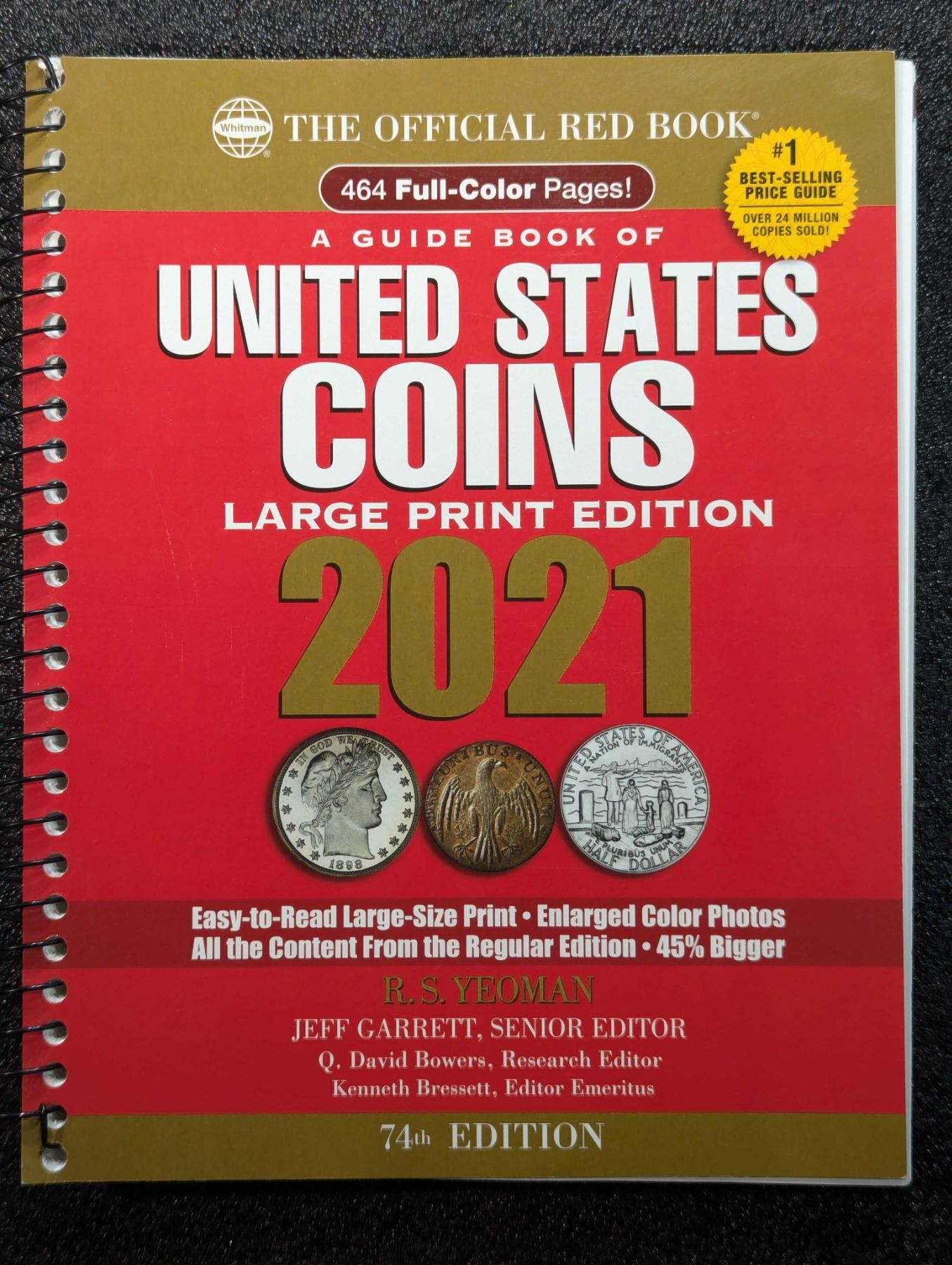 Yeoman, R.S., Jeff Garrett & Q. David Bowers & Kenneth Bressett [editors]. A GUIDE BOOK OF UNITED STATES COINS LARGE PRINT EDITION 2021. Whitman Publishing, LLC., Pelham. 2020. 4to. 462, (2) pages. original pictorial card covers, spiral binding. Color coin photos throughout. English text. The David Baker Library. Fine. The Red Book covers everything from early colonial copper tokens to hefty Old West Silver dollars and dazzling gold coins. You'll find 32,500+ prices for more than 7,600 coins, tokens, medals, sets, and other collectibles. You'll also round out your education in commemoratives, Proof and Mint coins, error coins, Civil War Tokens, Confederate coins, private gold, and all the latest National Park quarters, Presidential and Native American dollars, Lincoln cents, and more. Also includes articles on investing, grading coins, and detecting counterfeits; and entertaining essays on the history of American coinage, shipwrecks and hoards, and the modern rare-coin market. Lot weight: 2 lbs 7oz. Subject(s): United States Coinage.