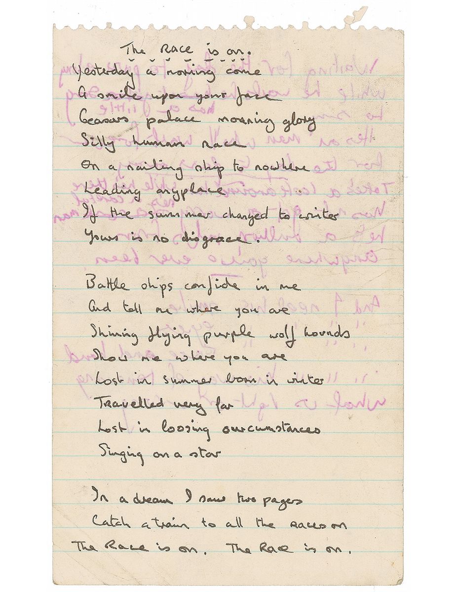 Handwritten lyrics to ‘The Race Is On,’ on an off-white 5 x 8 lightly-lined sheet of notebook paper, all written in the hand of Anderson. Lyrics read: