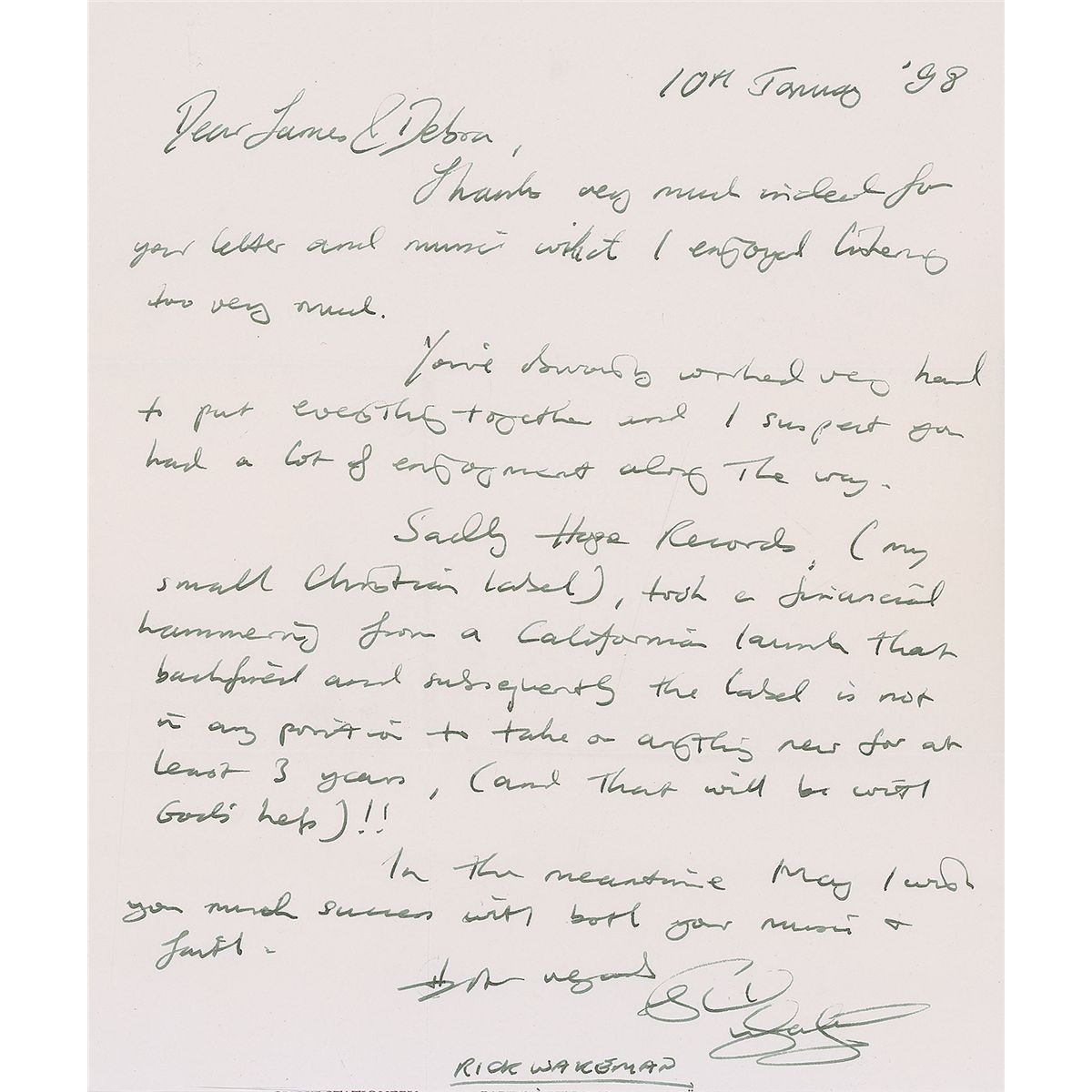 ALS signed “Rick Wakeman,” one page, 8.25 x 9.5, January 10, 1998. Letter to a couple that submitted music to Wakeman’s record label. In part: “Thanks very much indeed for your letter and music that I enjoyed listening too [sic] very much…Sadly, Hope Records, (my small Christian label), took a financial hammering from a California launch that backfired and subsequently the label is not in any position to take on anything new for at least 3 years, (and that will be with God’s help)!!” In fine condition, with a trimmed bottom edge. Accompanied by the original mailing envelope addressed in Wakeman’s hand.
