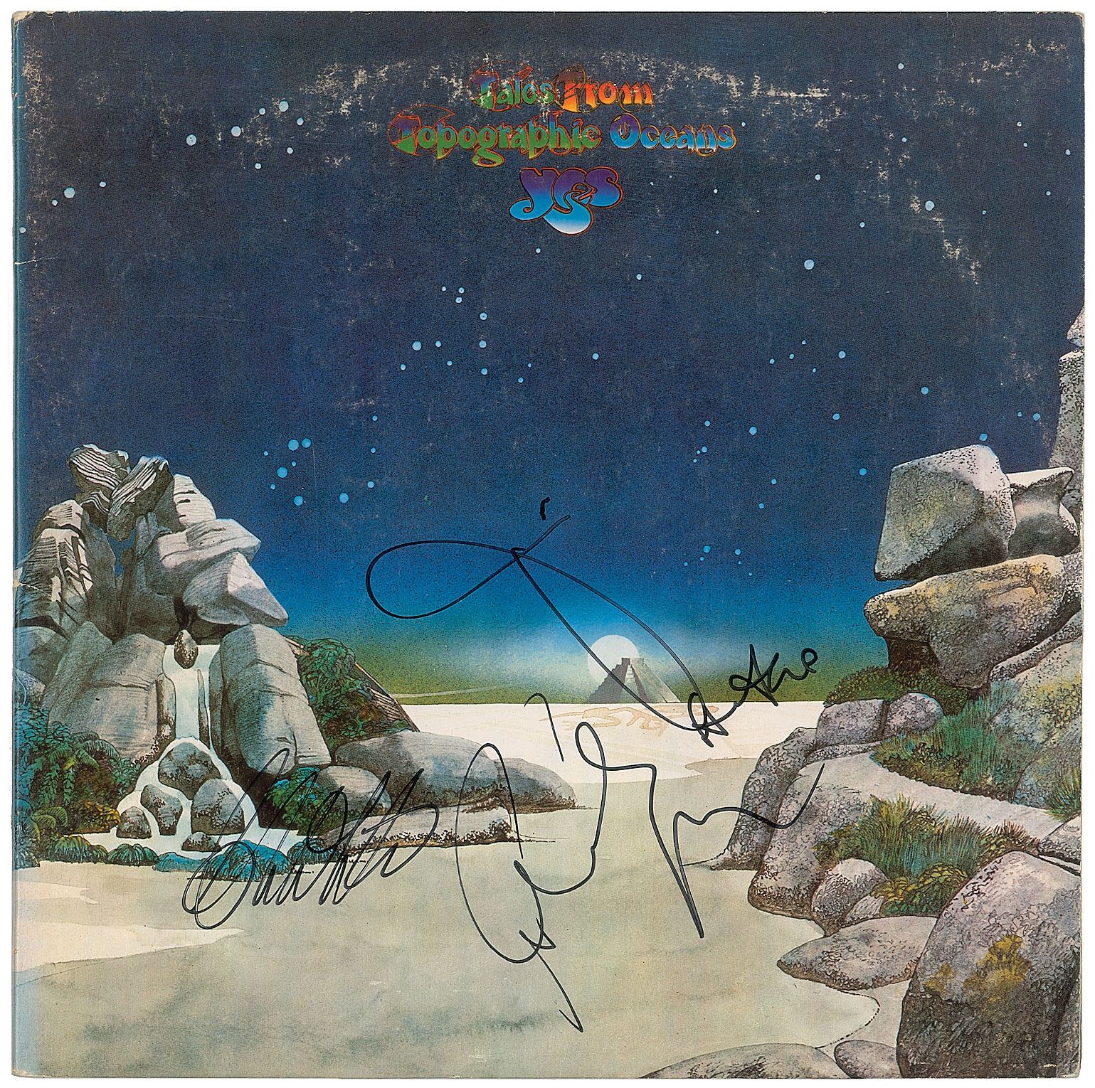 Tales from Topographic Oceans album signed on the front cover in black felt tip by Jon Anderson, Steve Howe, Chris Squire, and Alan White. In fine condition, with light scuffing. The record is included.