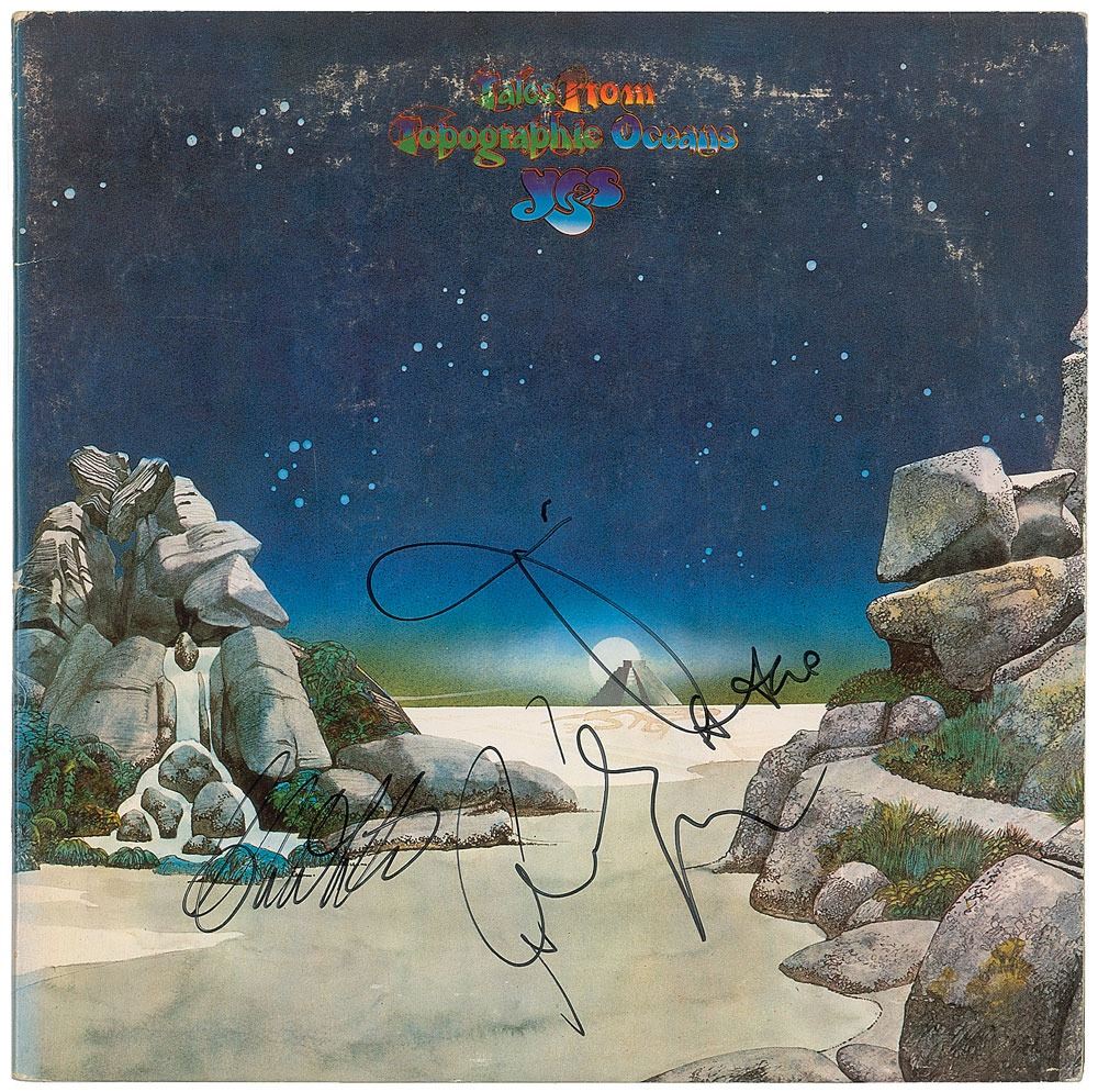 Tales from Topographic Oceans album by Yes, signed on the front cover in black felt tip by Jon Anderson, Steve Howe, Chris Squire, and Alan White. In fine condition, with light scuffing. The record is included. Accompanied by a John Brennan Collection letter of provenance.