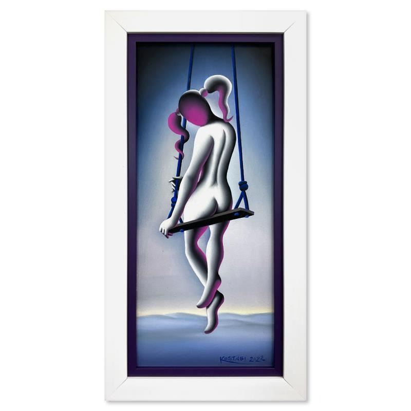 "Yes?" is an original oil painting on canvas by Mark Kostabi, hand signed by the artist. This piece comes framed. Includes Letter of Authenticity. Measures approx. 14" x 27.5" (frame), 9.5" x 23" (image).